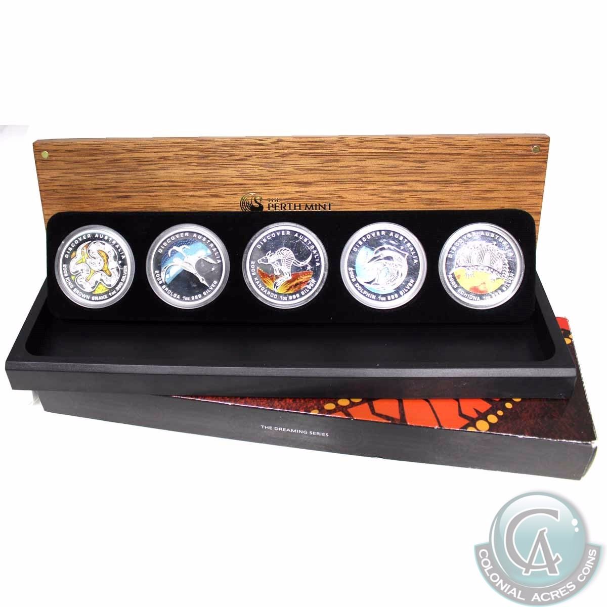 AUSTRALIA; 2009 Discover Australia Coloured 5-coin Animal Silver Dollar Proof Set (Tax Exempt). The five coins in this set are encapsulated in an elegant presentation case with a native Australian jarrah wood lid, protected by a full-colour outer box. The obverse displays an Indigenous Australian portrait of each of the five animals, in its native habitat as represented by the splashes of warm colour. Each coin contains 1oz of .999 Pure Silver (outer box is scuffed and torn in one corner)