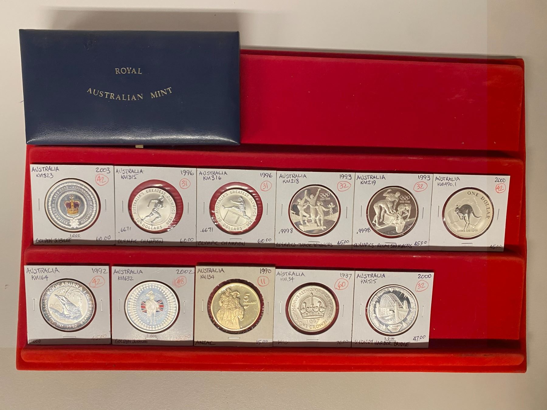 AUSTRALIA: LOT of 17 coins, including a 6 coin 1966 proof set in the original case, a 1937 crown AU-UNC, silver ounce 1992 KM 164 and 2000 KM490.1, 1993 Olympics 20 dollars KM 218 and 219, 1996 Olympics 10 dollars KM 315 and 316, colorized ounce dollar 2002 KM 632 and 2003 KM 823, Sydney Bridge KM 515 and Anzac 5 dollar proof 1990; retail value $600, lot of 17 pieces.