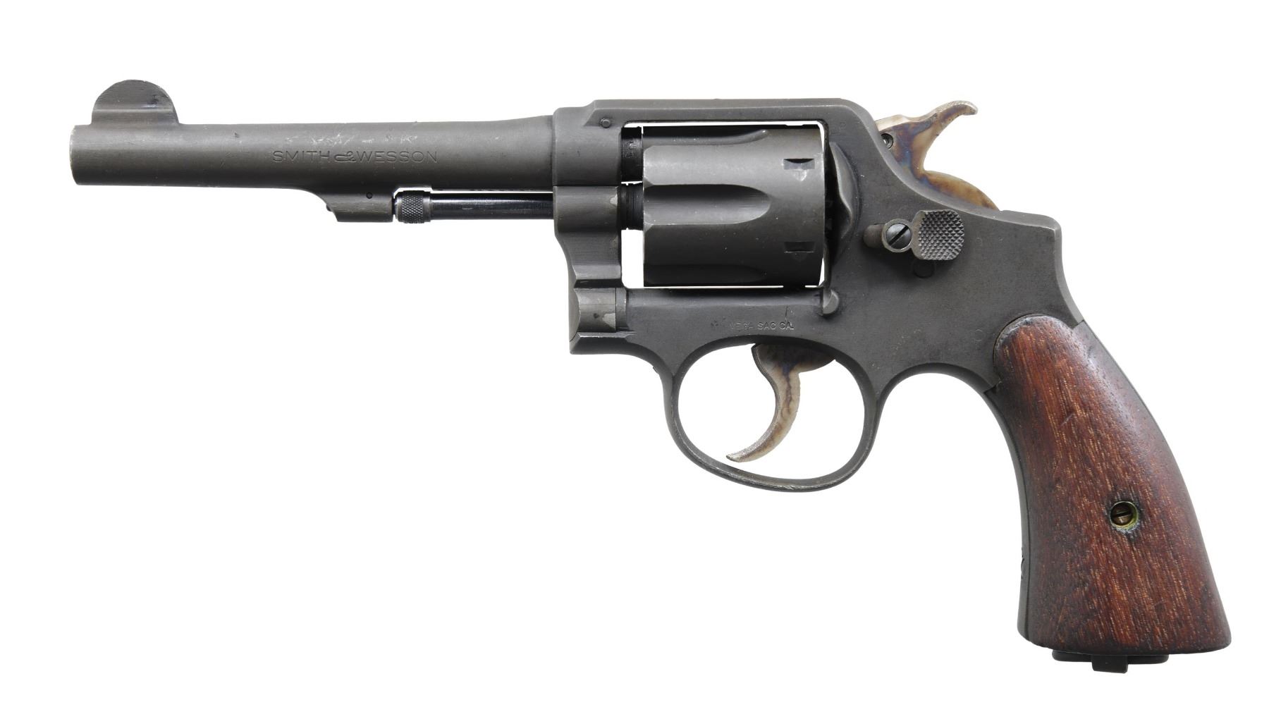REVOLVER. Cal. 38 S&W. S# V544099. Bbl. 5". Round blade front sight. Fixed rear sight. Matching numbers on frame, bbl., cyl. & extractor. Right side of frame has Australian "D (Broad Arrow) D" military marking & "MA 54" marking denoting arsenal refurb in 1954. Left side of frame has Vega import marking. Arsenal rework parkerized finish with case colored trigger & hammer. Smooth walnut grips with mismatched right panel. Lanyard ring present on bottom of grip panel. UNATTACHED ACCESSORIES: aftermarket black hardcase. CONDITION: grips show scattered dings & handling marks. Hammer & trigger retain most of their case colors with scattered edge wear. Balance of metal retains 92% arsenal rework parkerized finish with scattered light silvering & some light dings. Action functions properly when hand cycled. Very good bright bore. (24-6775/MJC). CURIO. $300-500.