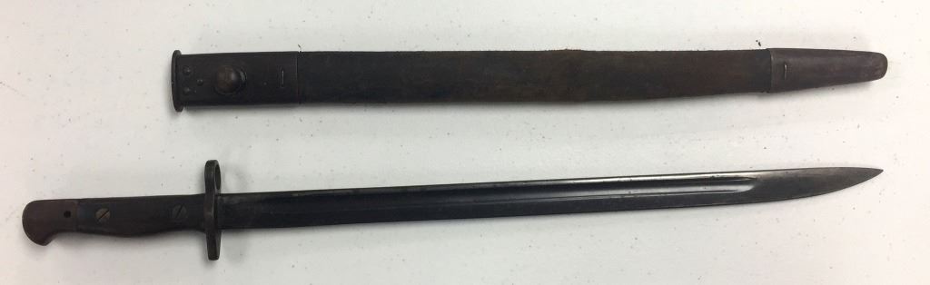 METAL AND LEATHER SCABBARD. 21.5 INCHES LONG.