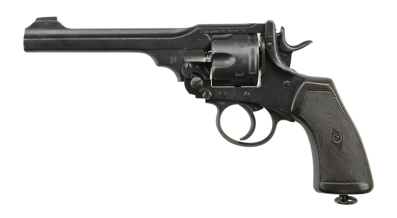 Cal. 455 Webley. S #243371. Bbl. 6". Cyl. modified to accept 45 Auto Rim. All matching numbers. SA & DA. Top of Bbl. has asterisk marking. Left side of frame is marked "WEBLEY/MARK VI/PATENTS/1916", Bbl. has British proofs and "MARK VI" markings. Left side of frame & bbl. marked w/ Australian "D broad arrow" markings. Left of frame also marked "3/3652". Brown plastic checkered grips. CONDITION: grips show a few small chipped areas & handling wear. Metal retains 85% arsenal reworked blue w/ some areas of blued over pitting, light freckling & fading. Fair bore w/ scattered frosting & some light pitting. (22-2419/MJC). CURIO. $300-500.