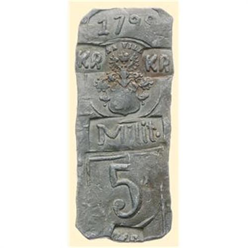 5 Kreuzer 1799 (61 x 26 mm, 19.85 g). Oblong lead plaquette with 6 stamps of the military camp in Moldauthein (czech Tyn nad Vltavou, southern Bohemia), Cassier Johann Velicius.