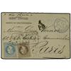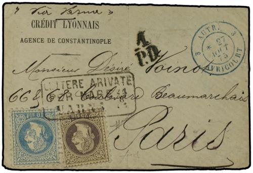 1875 (Aug) Cover from Constantinople to Paris endorsed ´Via Varna´ with Levant 1867-80 10s. blue and 25s. violet tied by bold strike of scarce "Lettere Arrivate/Per Mare/Varna" in black. Fine cover with Paris arrival in blue (Aug 27) on front. Certificate Sorani. Scott 4,6.