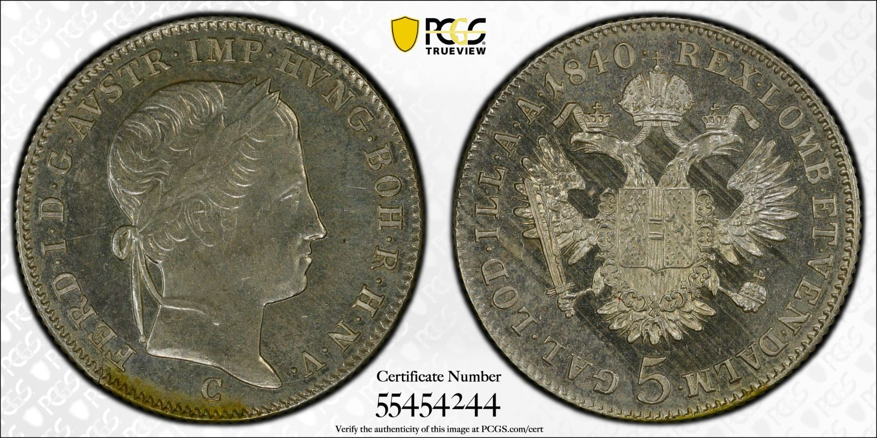 AUSTRIA: Ferdinand I, 1835-1848, AR 5 kreuzer, Prague, 1840-C, KM-2196, a wonderful mint state example! PCGS graded MS64.