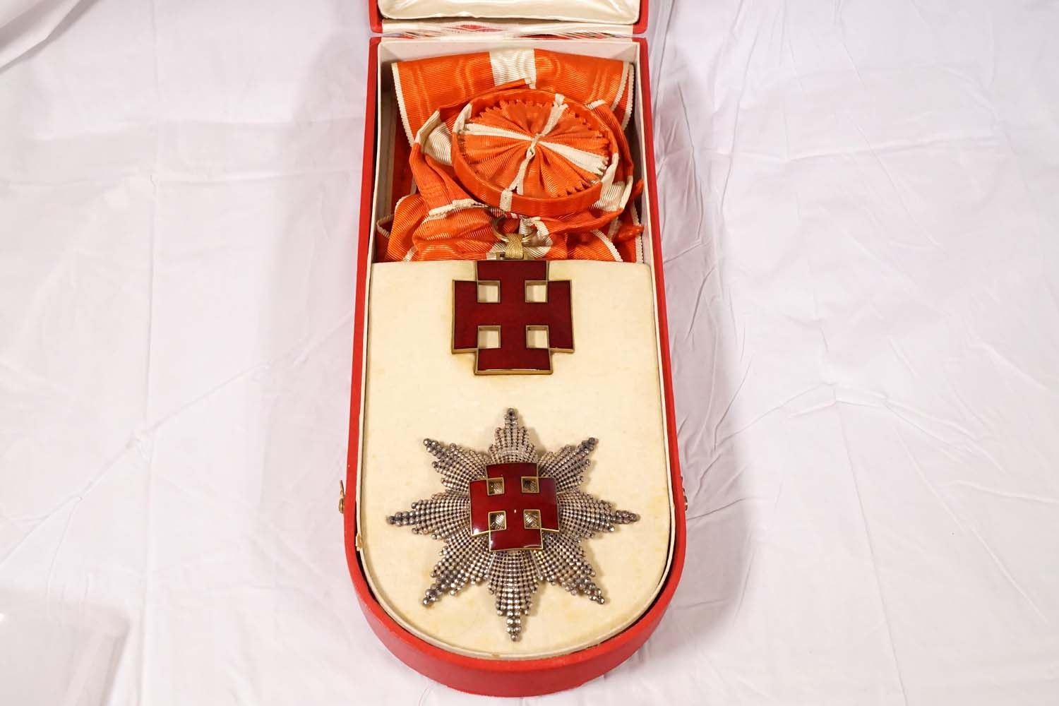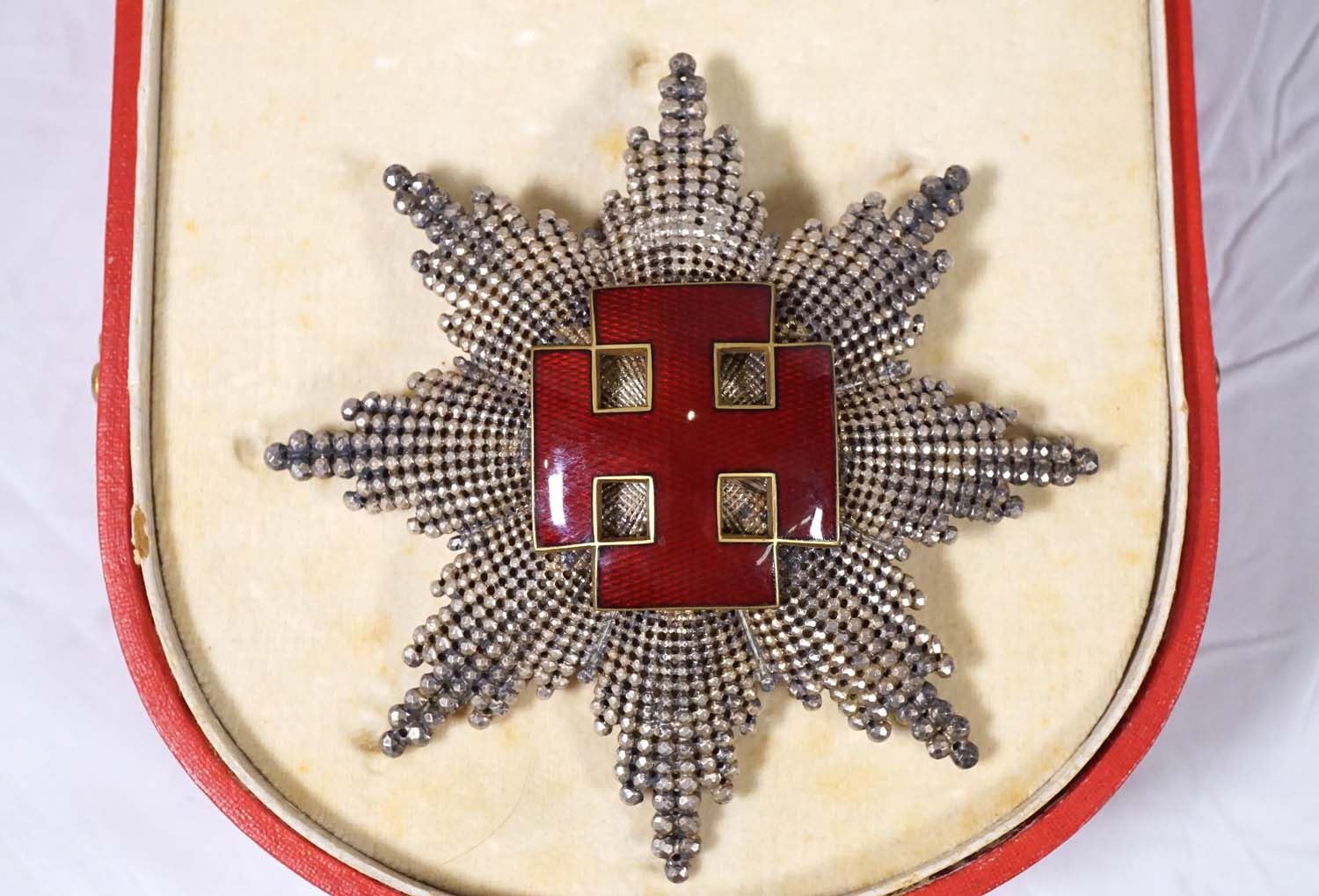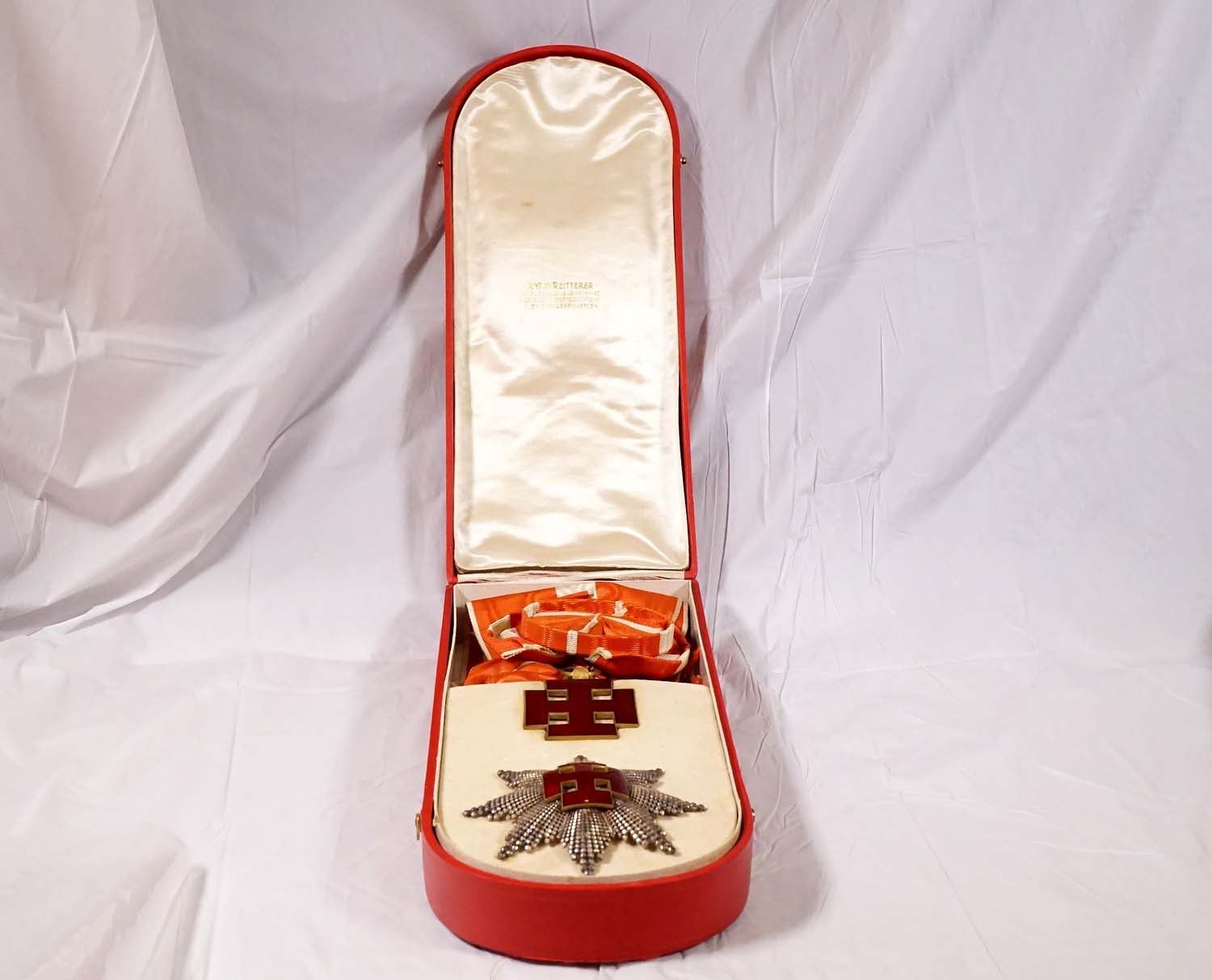 A Lot of 2 Medals 1 x Grand Cross Breast Badge; Obverse: silver gilded eight-pointed arms, with a matte black enameled Seipel’s cross. Reverse: has a vertical pinback and a functional hinge/catch assembly; disk marked “Anton Reiterer, Juwilier, Wien IX, Schubertring 24”; measuring 95.79 mm (w) x 96.49 mm (h); weighing 83.8 grams. & 1 x The Grand Cross Sash Badge; featuring a gilded silver matte black enameled Seipel’s cross with a triple loop suspension from an original sash ribbon featuring a large rosette; measuring 48.41 mm (w) x 51.33 mm (h). all in the original red box.