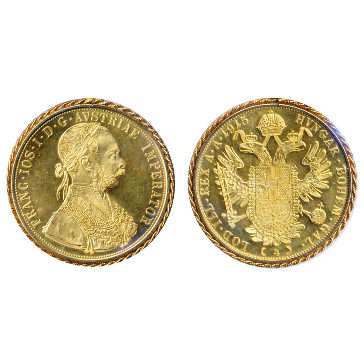 AUSTRIA. Four Ducats. 1915. KM#2276. (AGW .4430 oz.). A restrike with mirror-like fields. Unc. Along with a 12k. Thin rope bezel and a thin 14k gold chain.