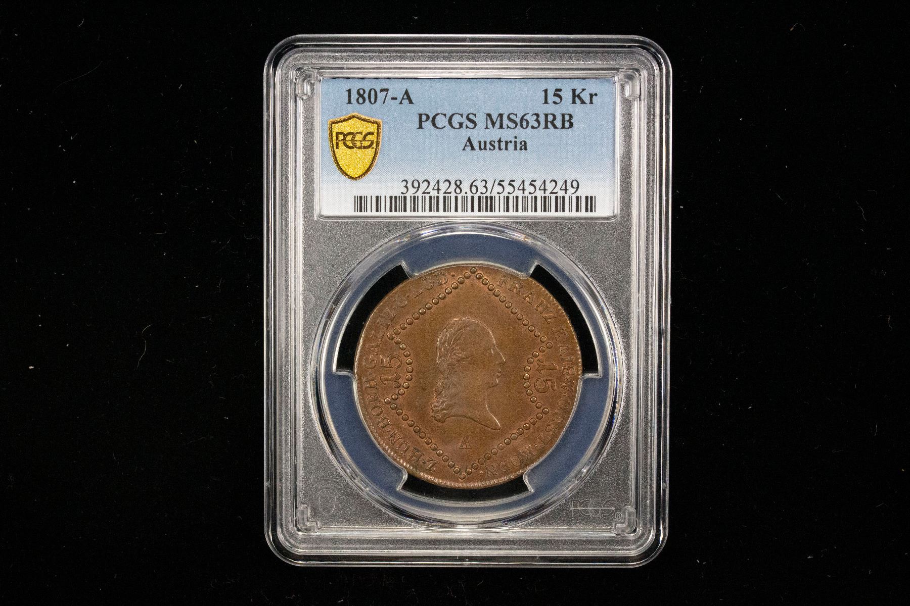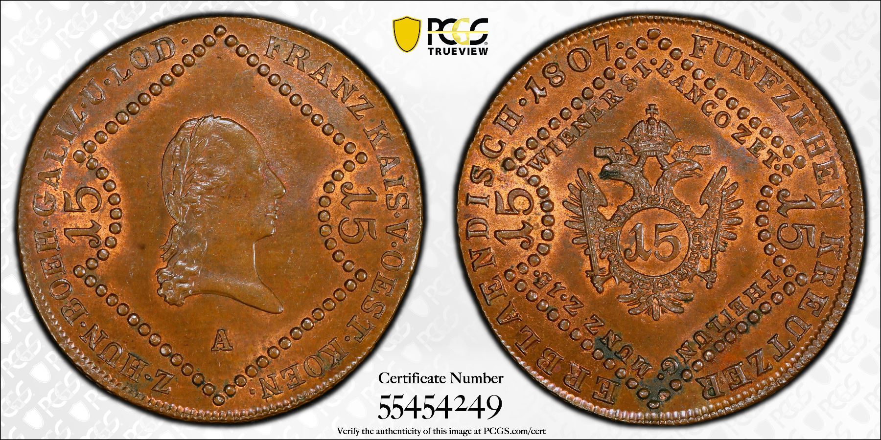 AUSTRIA: Franz I, 1806-1835, AE 15 kreuzer, Vienna, 1807-A, PCGS MS63 RB