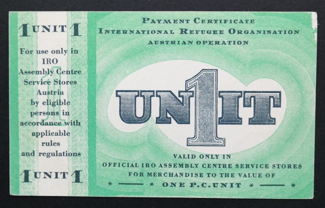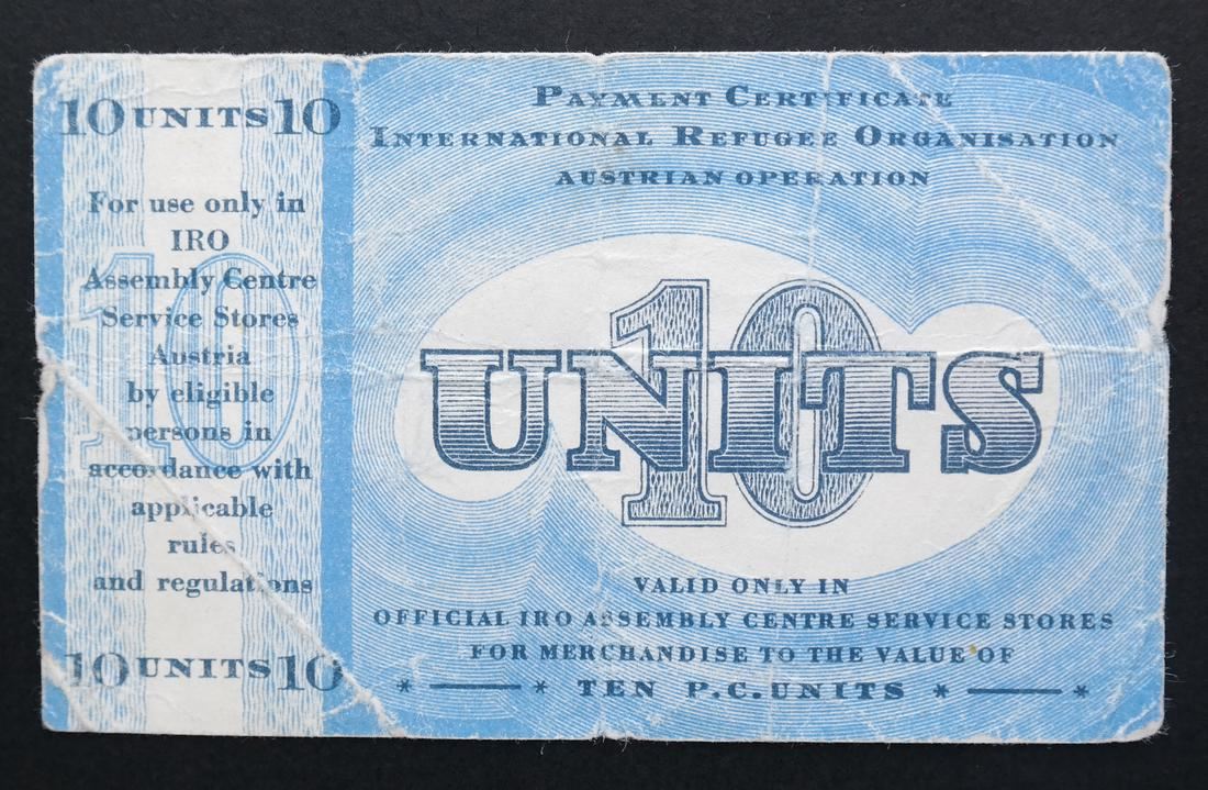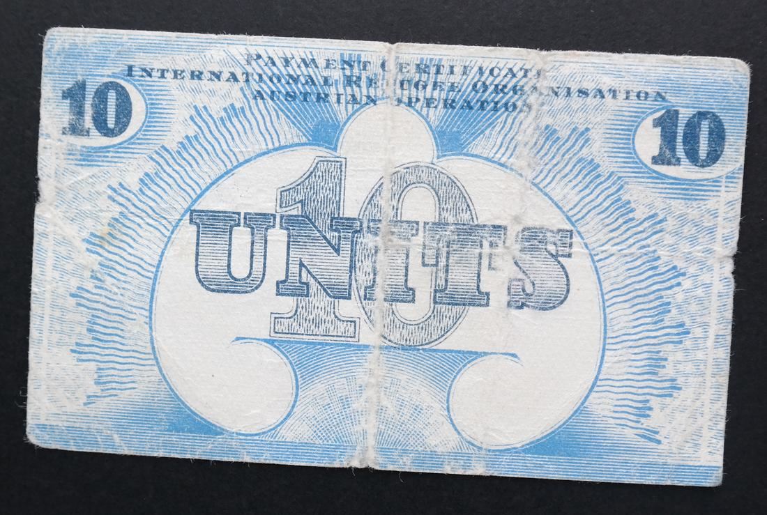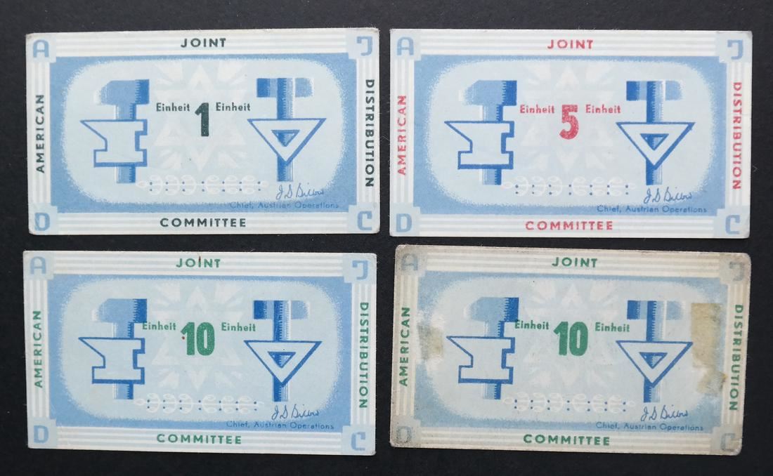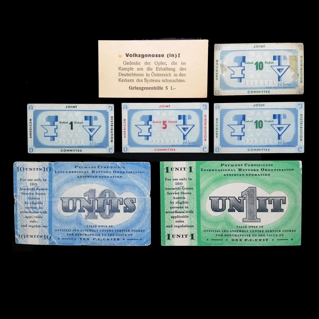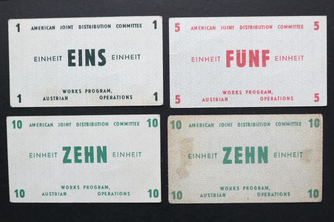 Includes IRO 1 Unit and 10 Units notes, American Joint Distribution Committee Works Program 1, 5 and 10 coupons, and a prisoner help/aid coupon, mixed condition from Fine to Uncirculated.