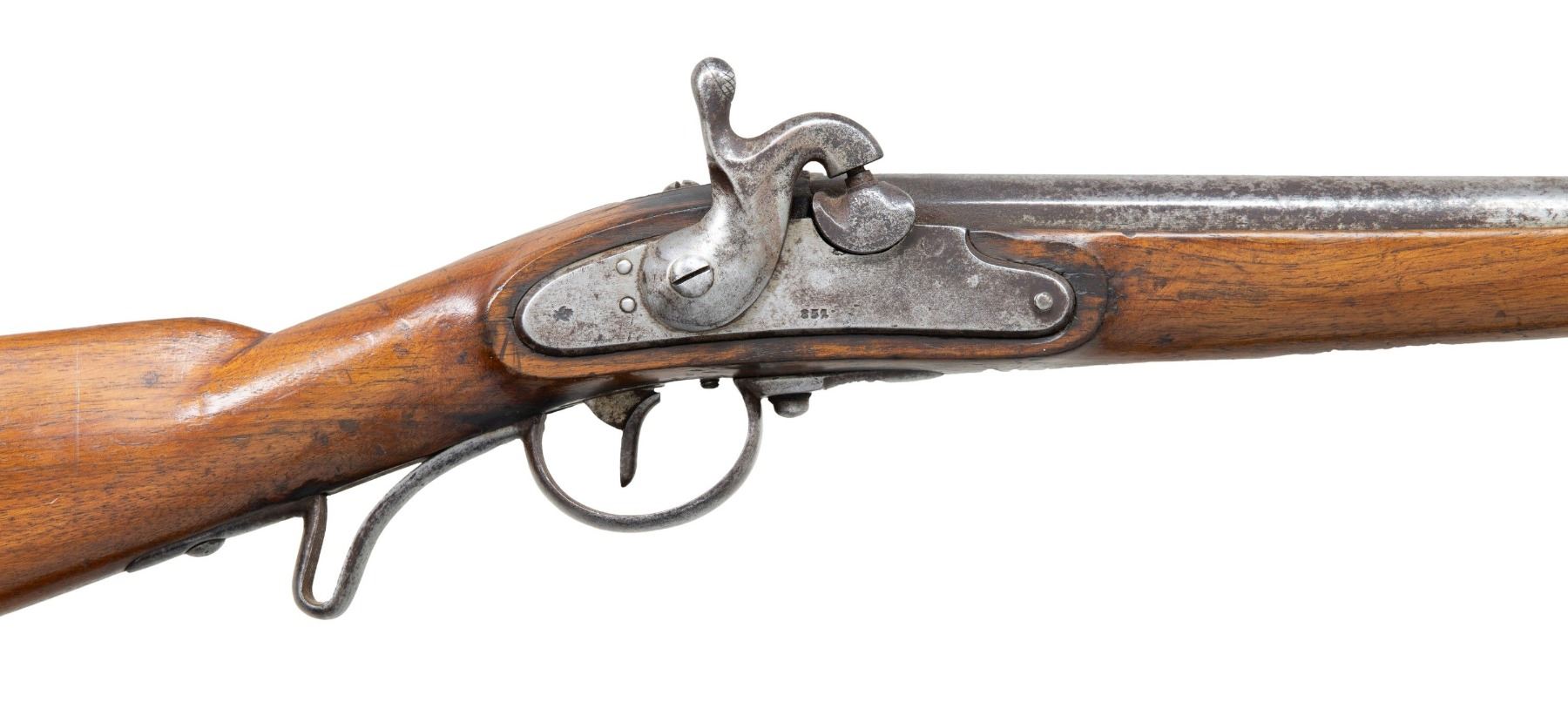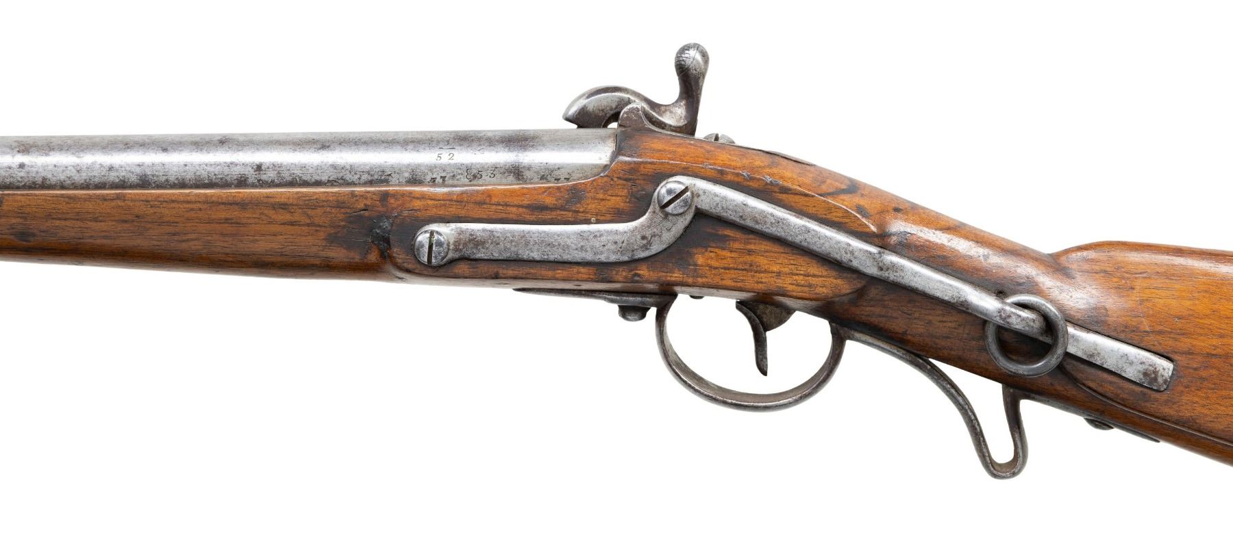 Cal. 70. NSN. Bbl. 14 1/2". Blade front sight. Fixed rear sight. Austrian 1851 cavalry carbine used by both sides of the American Civil War. Lock marked "851". Left side of bbl. marked "3/52" & "853". Finger curl trigger guard. Walnut stock with left side saddle ring & cheekpiece. Ramrod present that appears to be an old replacement. CONDITION: refinished stock has old varnish with a few repairs, some black staining, scattered dings & handling marks. Metal has a silvery-gray cleaned appearance with scattered oxidation, dings & light pitting. Action appears functional when hand cycled. Bore shows scattered notable pitting & oxidation but evident rifling. PROVENANCE: Estate Collection of Nicholas Apergis (01-27462/MJC). ANTIQUE. $300-500.