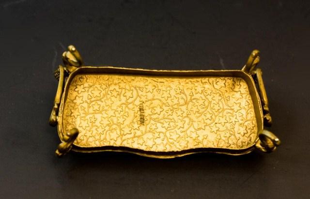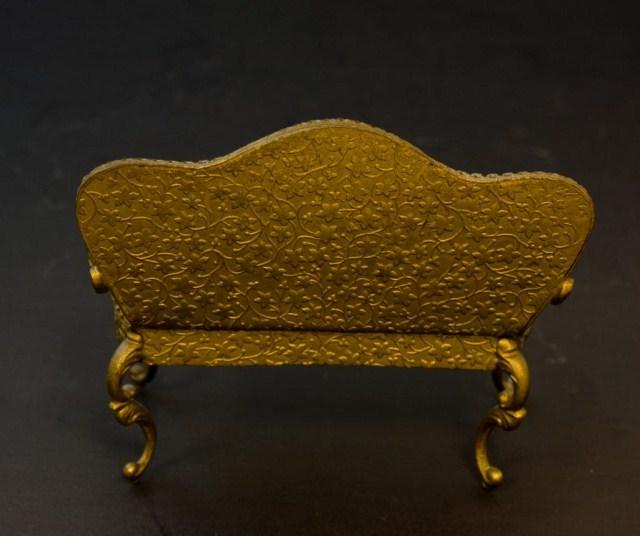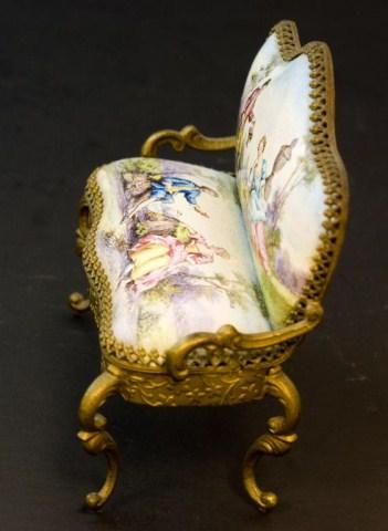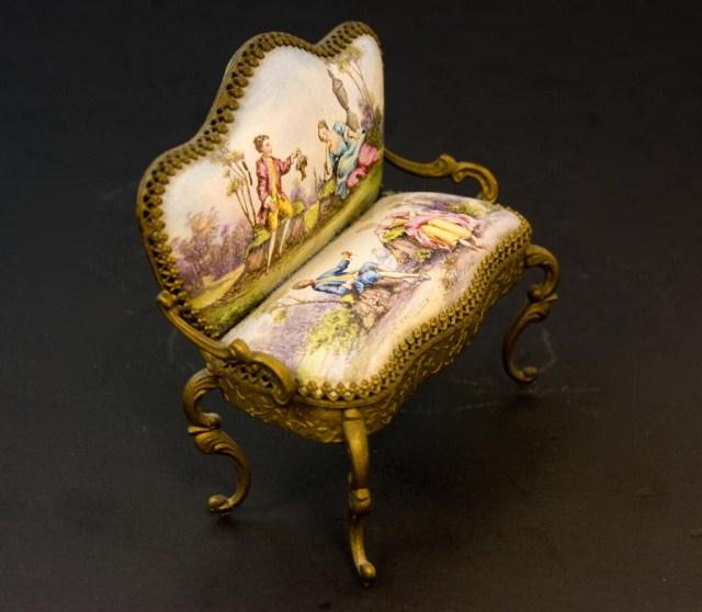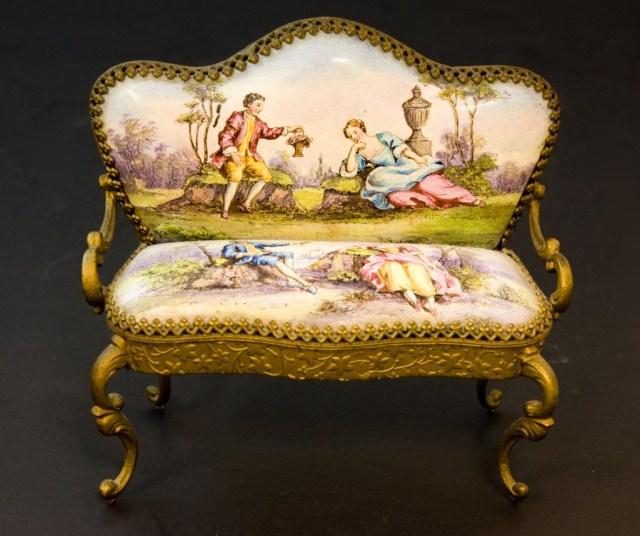 Has two courting scenes of men and women near trees. Bronze has raised floral design and scrolled arms and legs. Marked Austria to bottom. Measures 2 3/4" h X 3 1/8" w X 1 1/2" d.