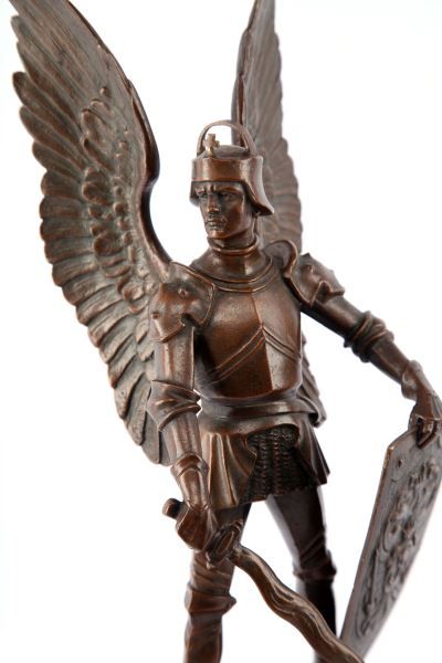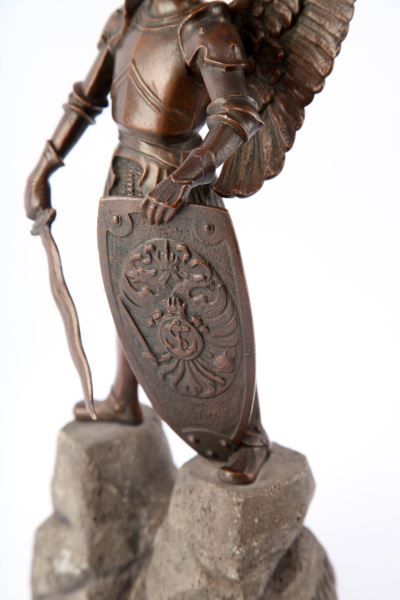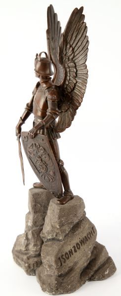 Bronze statue of St. Michael guarding the border of Austria. Side of base is marked "ISONZO WACHT", referring to the WWI Battles of the Isonzo between the Astro-Hungarian and Italian forces. Statue measures 18 inches tall including base, in excellent condition. This lot has a reserve