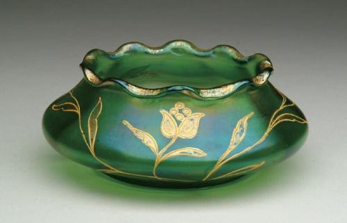 AUSTRIAN DECORATED VASE. Nice Austrian vase has squat body with ruffled rim and gold enameled stylized flower and leaves. Authentic period Austrian vase carries "Loetz Austria" signature which was added later. SIZE: 5-1/2 in. dia. CONDITION: Very good to excellent. Collection of Dr. C. and Margaret Chastain 5-61452