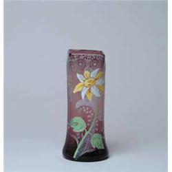 Lot 1260 AUSTRIAN ENAMELED VASE. Lovely amethyst vase has heavily enameled yellow and white flower with green stem and leaves. Lacy white enameling depicts background leaves and flowers as well as a lace trim at the top. Signed on side with etched signature "Moser". SIZE: 8-1/2" t. CONDITION: Very good to excellent. 5-68828 (200-400)