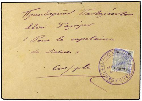 (1910 CA.) Undated cover to the Captain of a ship at Constantinople franked by Levant 1pi on 25h blue tied by Prastoreion-Afion 40 Ship´s Purser´s cachet in violet. Unusual and interesting cover..