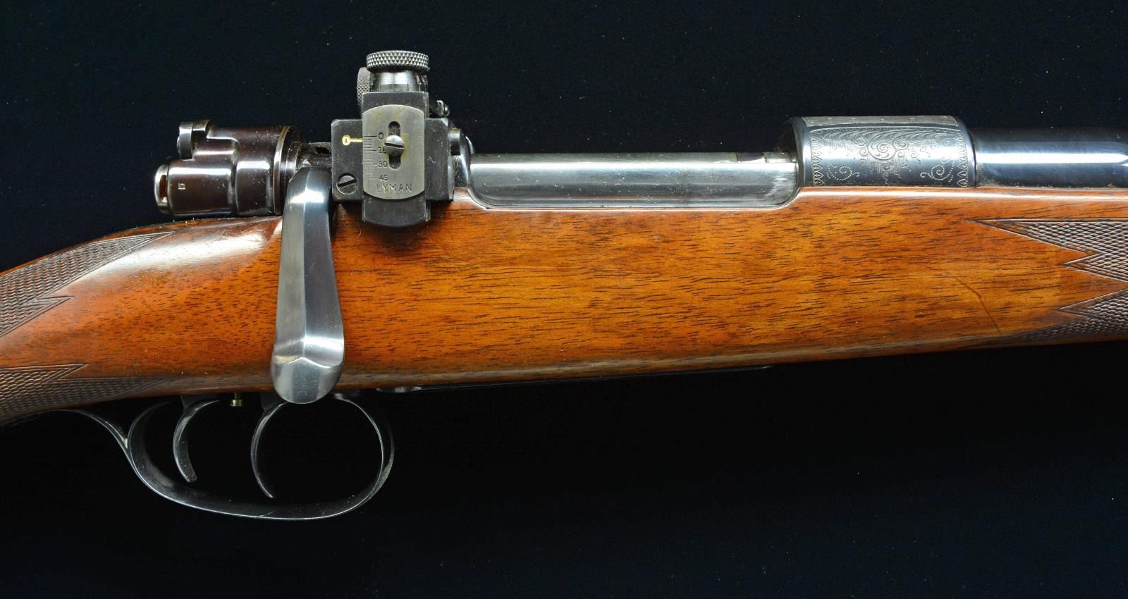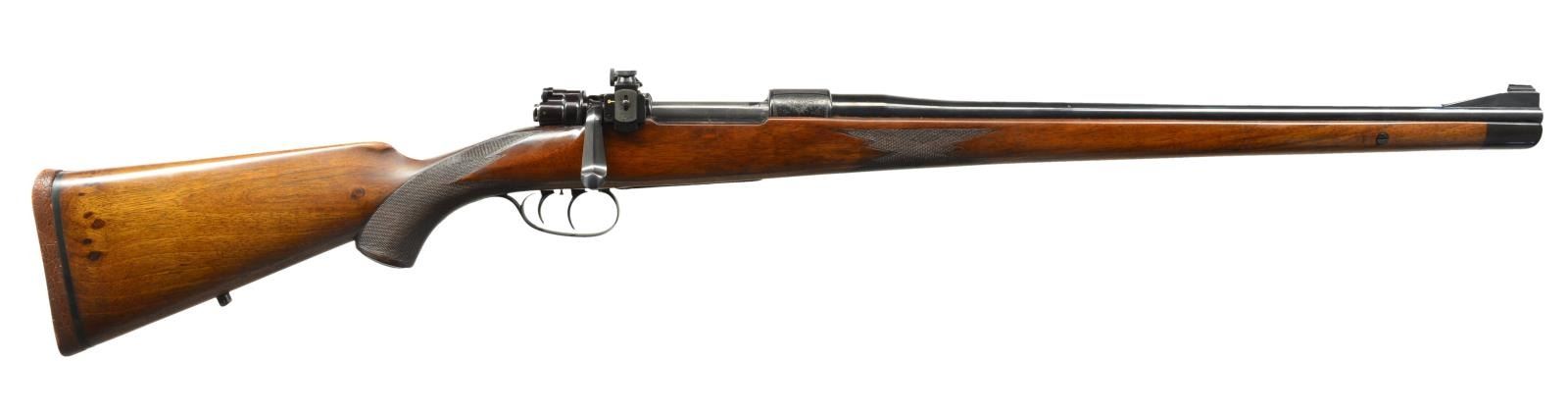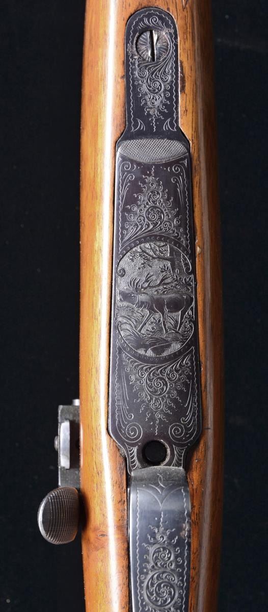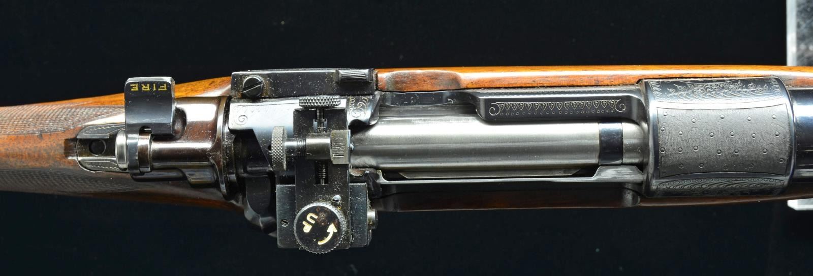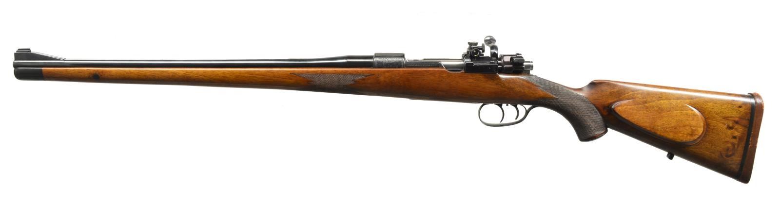 RIFLE BARRELED IN .257 ROBERTS BY NORRIS MORGAN. Cal. .257 Roberts. S#2244. Bbl. 20 1/2" is fitted w/ tall front sight ramp & is not caliber marked. Lg. ring model 98 action is fitted w/ Lyman 57 receiver sight. Bolt handle is of butterknife type. Flag safety is gold inlaid "FIRE" & "SAFE". Bottom metal is fitted w/ double set triggers. Trigger guard is of shotgun type. Action is engraved w/ sprays of scroll w/in geometrical borders. Top of receiver ring is stippled. Bottom metal & trigger guard are also scroll engraved. Scroll on floorplate surrounds vignette of roaring stag in woodlands. Full length stock of relatively plain European walnut features horn capped pistol grip, horn forend tip, sm. shadowline right hand cheekpiece & closely spaced multi point pattern checkering at grip & on forend. UNATTACHED ACCESSORIES: Norris Morgan inventory sheet & letter. CONDITION: fine as refinished. Metal parts retaining nearly all immersion reblue w/ some minor staining & pitting at grip area of trigger guard. Stock has most of what appears to be its original oil finish w/ some added oil. Pad is crazed & compressed. Bore is excellent, mechanically good. (20-1684/MGM57). CURIO. $500-900.