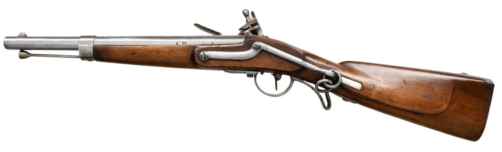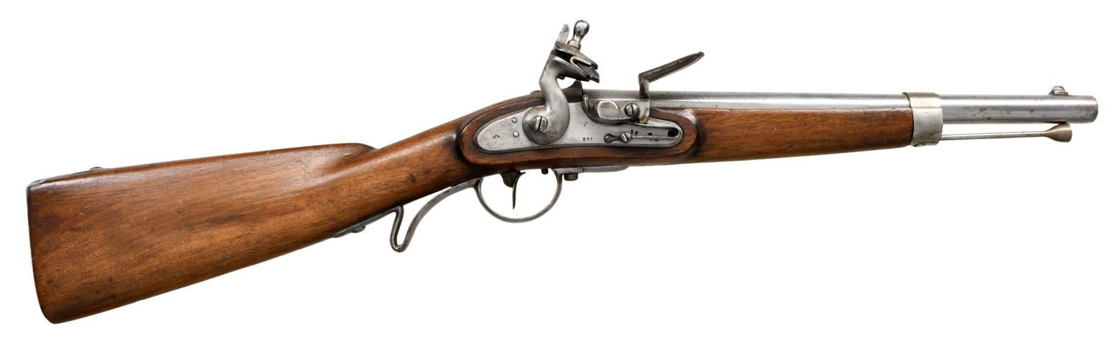 Cal. 70. NSN. Bbl. 14 1/2" smooth bore. Fixed rear sight. Blade front sight. Right side of lock has "851" for 1851 date & Austrian eagle. Top of bbl. has inspector's stamps. Brightly finished metal. European hardwood stock w/ cheekpiece. Left side of stock has saddle bar w/ ring. Replacement rarmod present. CONDITION: stock has added finish w/ a couple grain chips forming on belly, scattered dings & handling marks. Metal has been cleaned to bright w/ scattered oxidation. Moderately oxidized bore. (01-23666/MJC). ANTIQUE. $400-600.