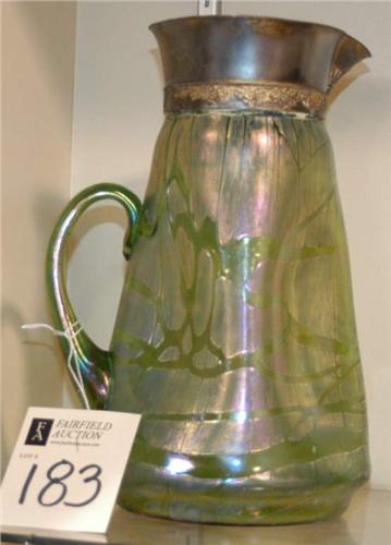 AUSTRIAN OR CZECH ART GLASS PITCHER with silverplate collar, manner of Loetz 12" high circa 1910 <BR>condition: excellent