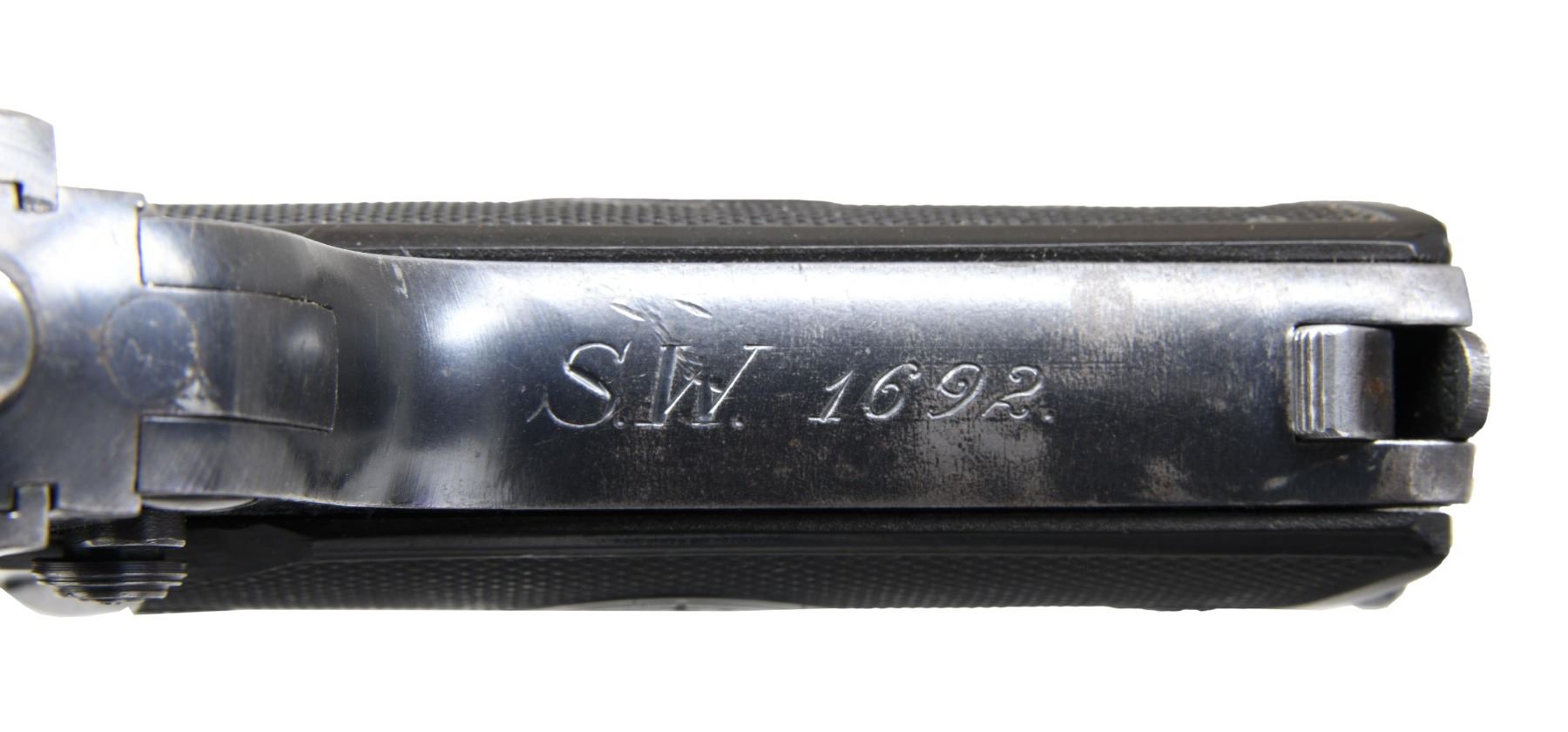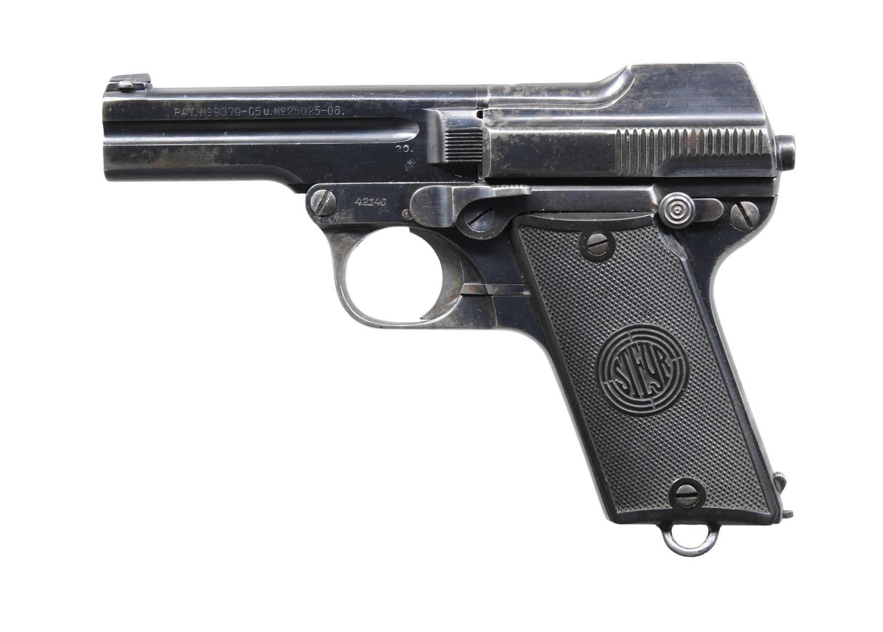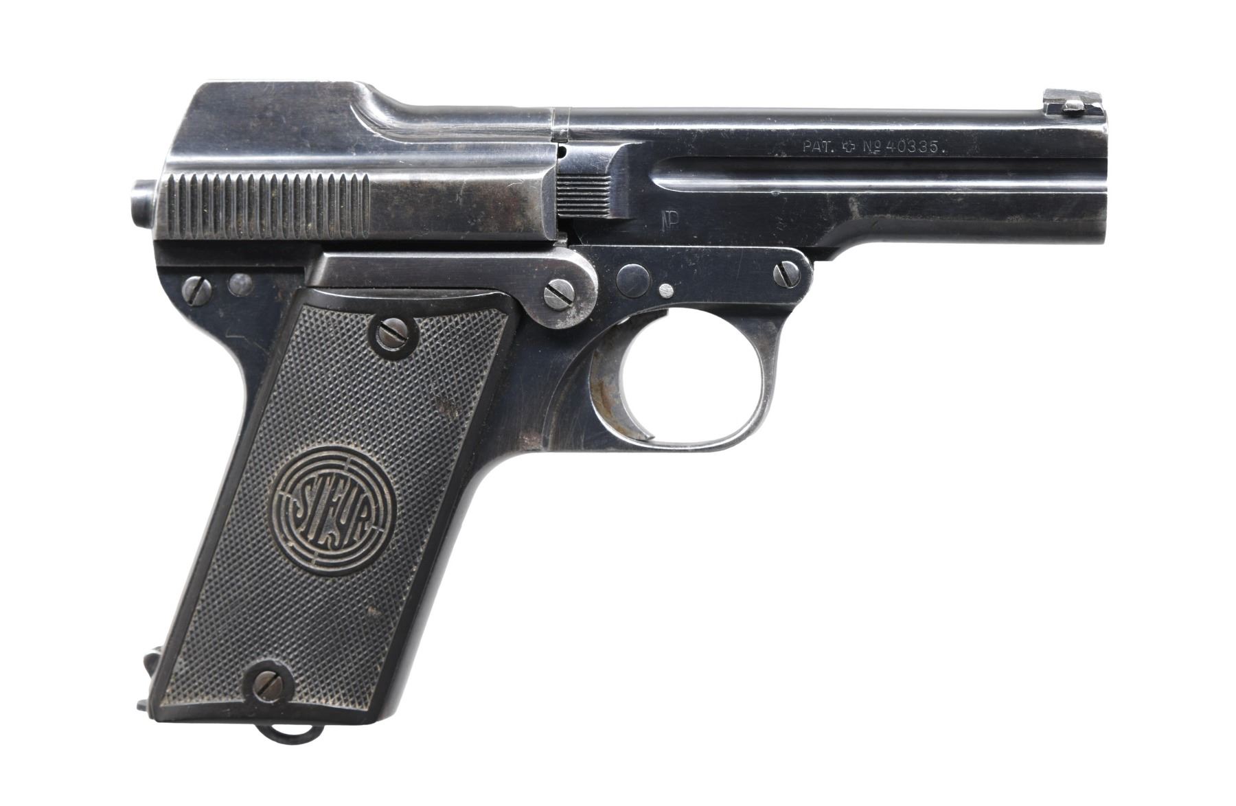 SEMI-AUTOMATIC PISTOL. Cal. 7.65mm. S# 42146. Bbl. 3 1/2". Originally mfg. as a standard Model 1908, this example was subsequently updated to the Model 1908/34 configuration via the addition of a new, sturdier slide. The left side of the bbl. is marked with patent information, followed by a "20." above an Austrian proof, with additional patent information and an Austrian "NPV" proof marked on the right. Rear grip strap is engraved "S.W. 1692," indicating Austrian police issue. Metal components exhibit a period-reapplied blue finish overall. The frame is mounted with 2-piece Steyr checkered black hard rubber grips. Dovetailed blade front sight with integral V-notch rear sight. Matching numbers are present on the frame, slide, and bbl. MAGS: One 7-rd. CONDITION: Good, with metal components retaining the majority of their period-reapplied blue finish, exhibiting areas of wear and thinning that show through to gray patina, as well as scattered spots of light surface oxidation and pitting overall. Bright bore, exhibiting consistent light to mild pitting while retaining well-defined rifling throughout. Grips show some smoothing, as well as some scattered nicks and marks from handling and storage, but otherwise remain sturdy and serviceable. (24-7185/MLW). CURIO. $200-300.
