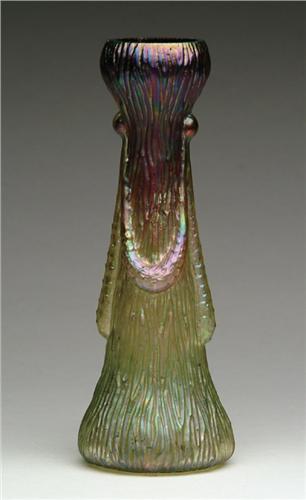 AUSTRIAN VASE. Wonderful Austrian art glass vase has freeform body with impressed bark design and molded garland draping about the neck. Nice iridescent finish shades from green at the bottom to red at the top. SIZE: 9 in. t. CONDITION: Some roughness at the lip, otherwise very good to excellent. Collection of Dr. C. and Margaret Chastain 5-61457