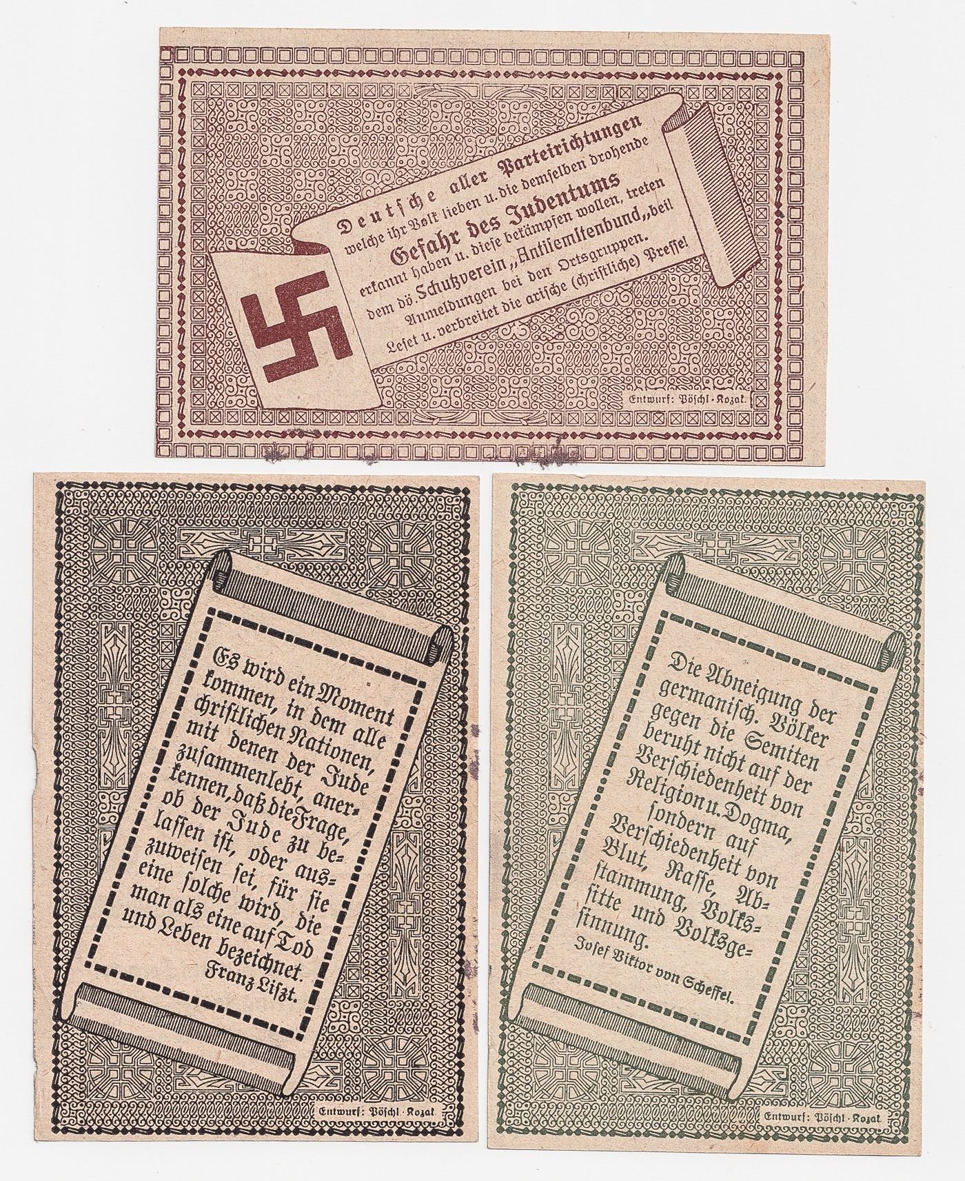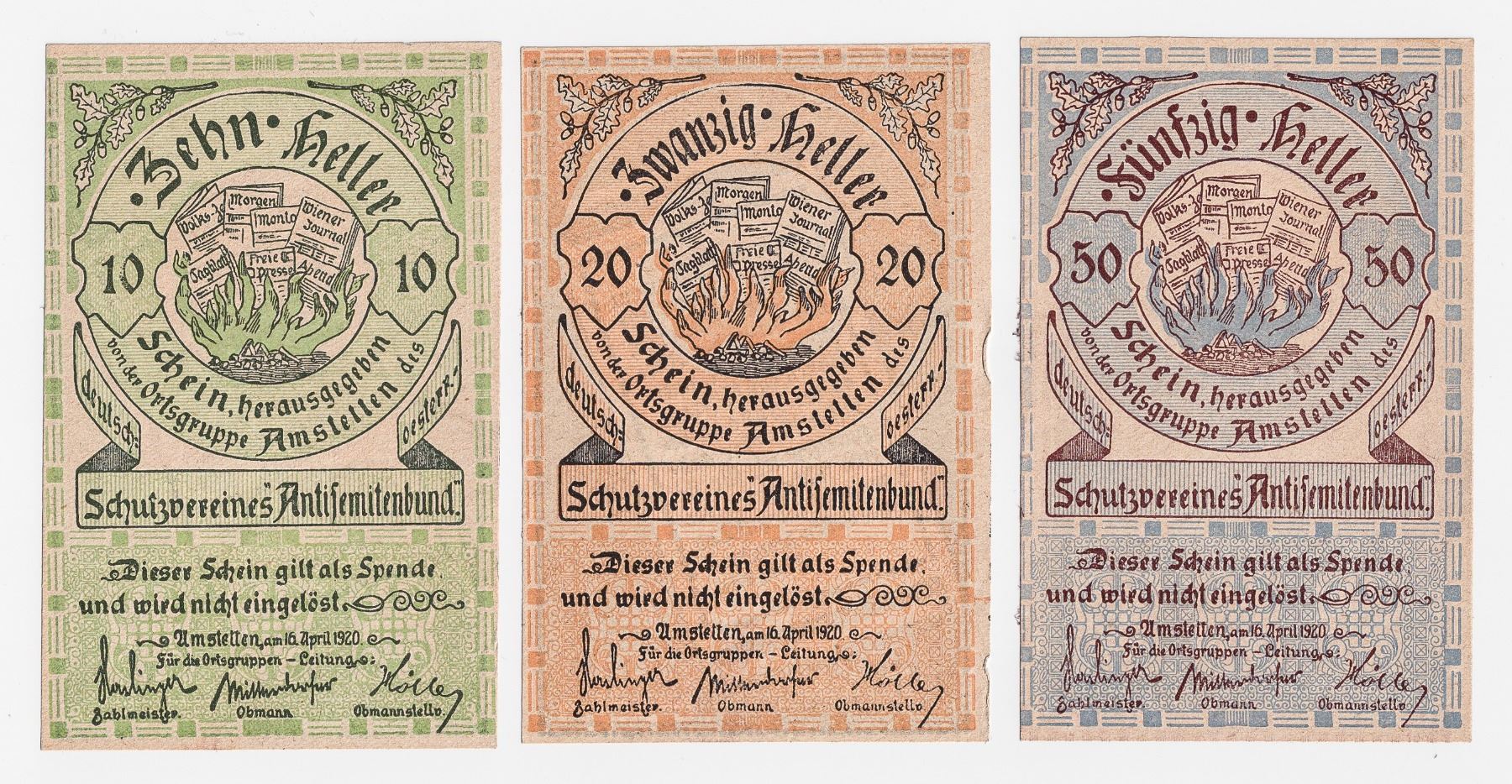 Scarce Austrian xenophobic Notgeld banknotes from 1920 issued by the Amstetten group (Austria) of the German-Austrian Protection Association Anti[emite League (Deutschosterreichischer Schutzverein Anti[emitenbund), issued in April 1920 in denominations of 10, 20, and 50 Heller, illustrated with images of seven liberal Austrian newspapers accused of being 'Judenpresse' (Jewish press) burning and quotes against Jews on the back, 'German of all parties..who have recognized the danger of the Jewry and want to fight it join the Schutzverein 'Anti[emitenbund'...read and distribute the Arian (Christian) press!', 'The aversion of the Germanic people against Semites is not based on the differences of religion but the difference of blood, race heritage...', 4 x 2.5 inches. The group was forbidden in 1933, but was allowed to exist due to the close affiliation to the NSDAP. Three pieces.