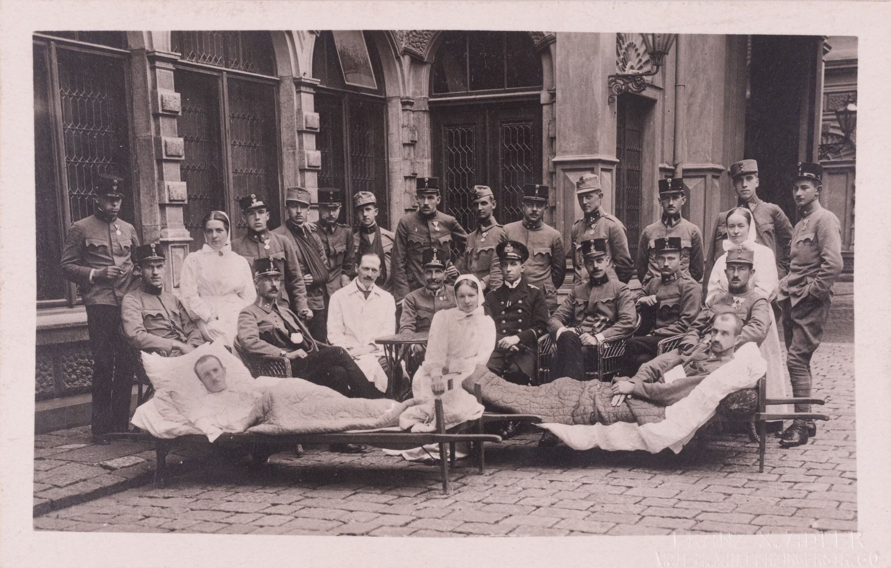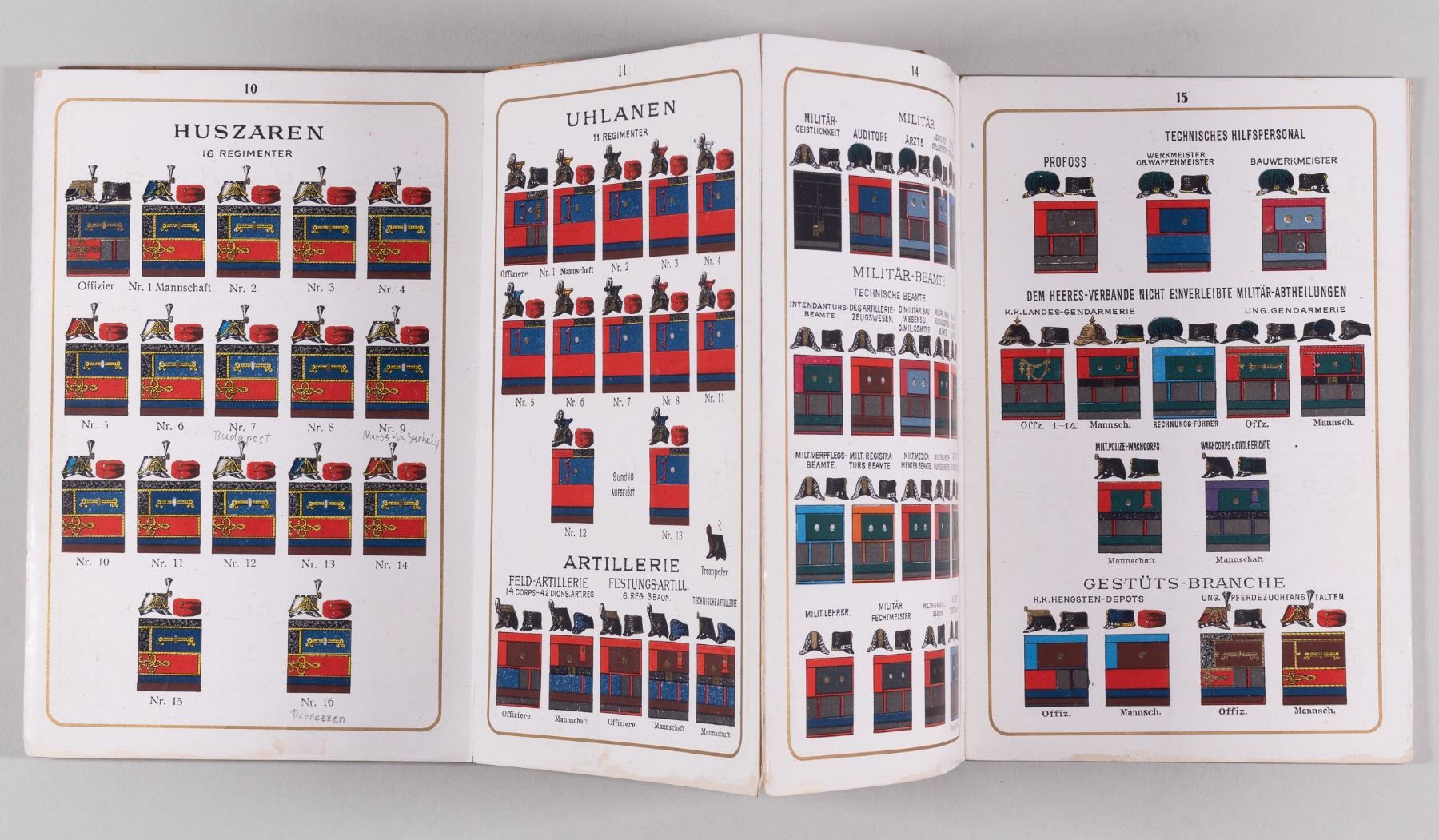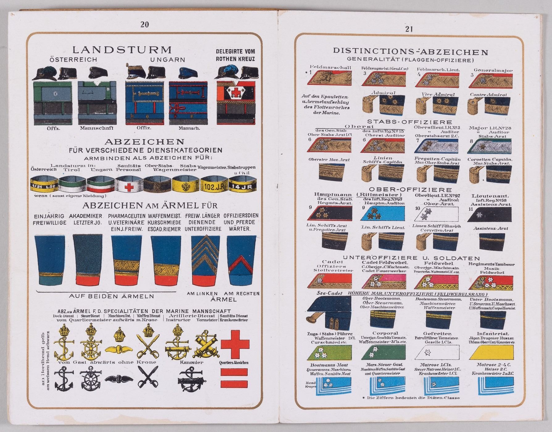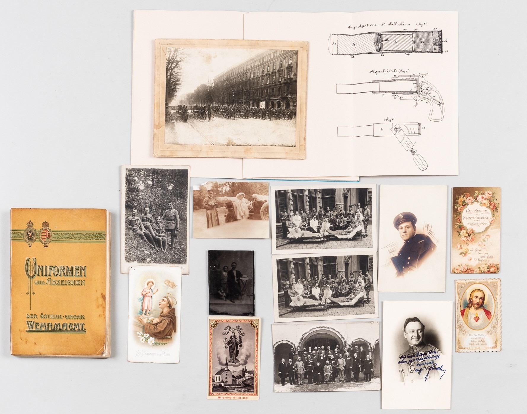 Group lot of WWI military photos showing Austro-Hungarian soldiers, a book titled, 'Uniforms and Insignia of the Austro-Hungarian Army' from 1909, and Catholic prayer cards, likely belonging to a WWI soldier. Photos approx. 3 x 5 inches. 15 pieces.