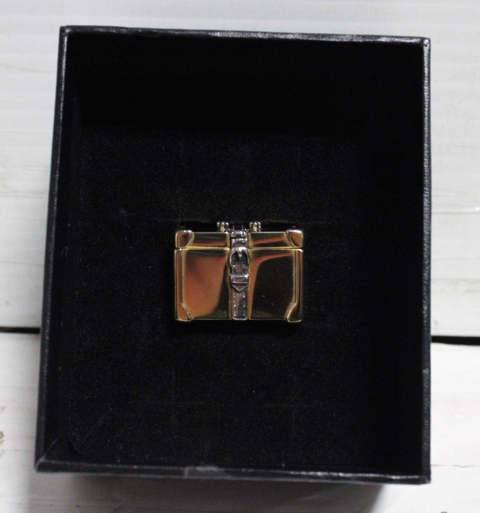 GOLD PLATED TRUNK PILL BOX STAMPED "GUCCI MADE IN ITALY", 3 CM L X 2 CM H X 2 CM W, NO VISIBLE SCRATCHES-RECENTLY POLISHED, SET IN A PLAIN BLACK VELVET FOAM GIFT BOX SIMILAR TO THE ORIGINAL