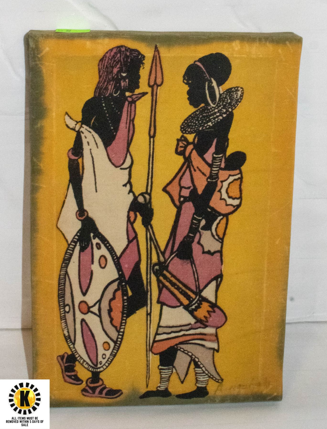 ORIGINAL KENYAN MAASAI ARTISAN SIGNED STRETCHED FABRIC ART ON WOOD FRAME
