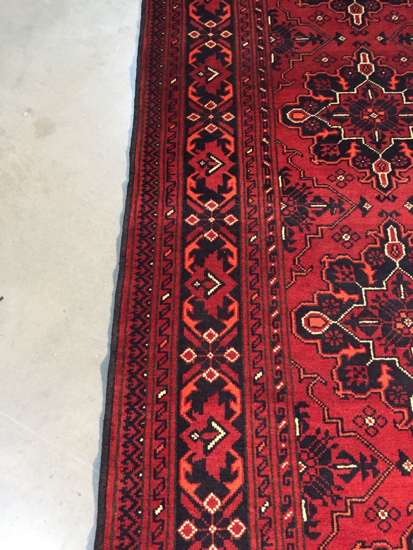 2'.10"X9'.6" Authentic classic Afghan Runner, in deep red, charcoal colors Vege dye 100% Natural wool pile Hand knotted and woven in Afghanestan