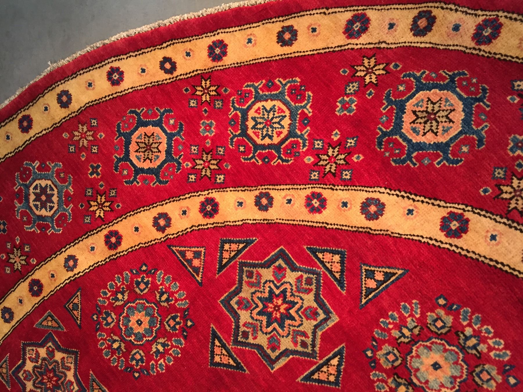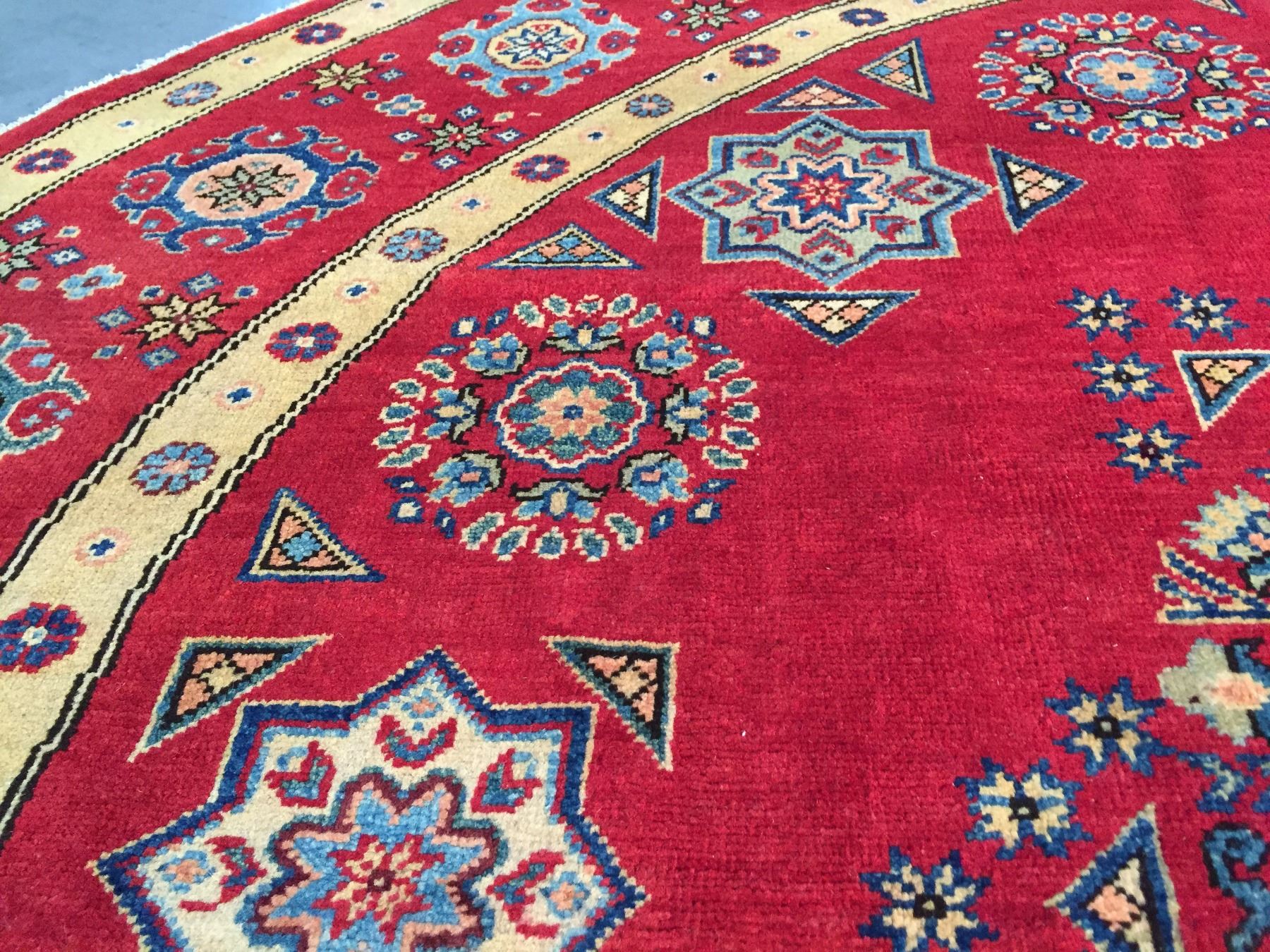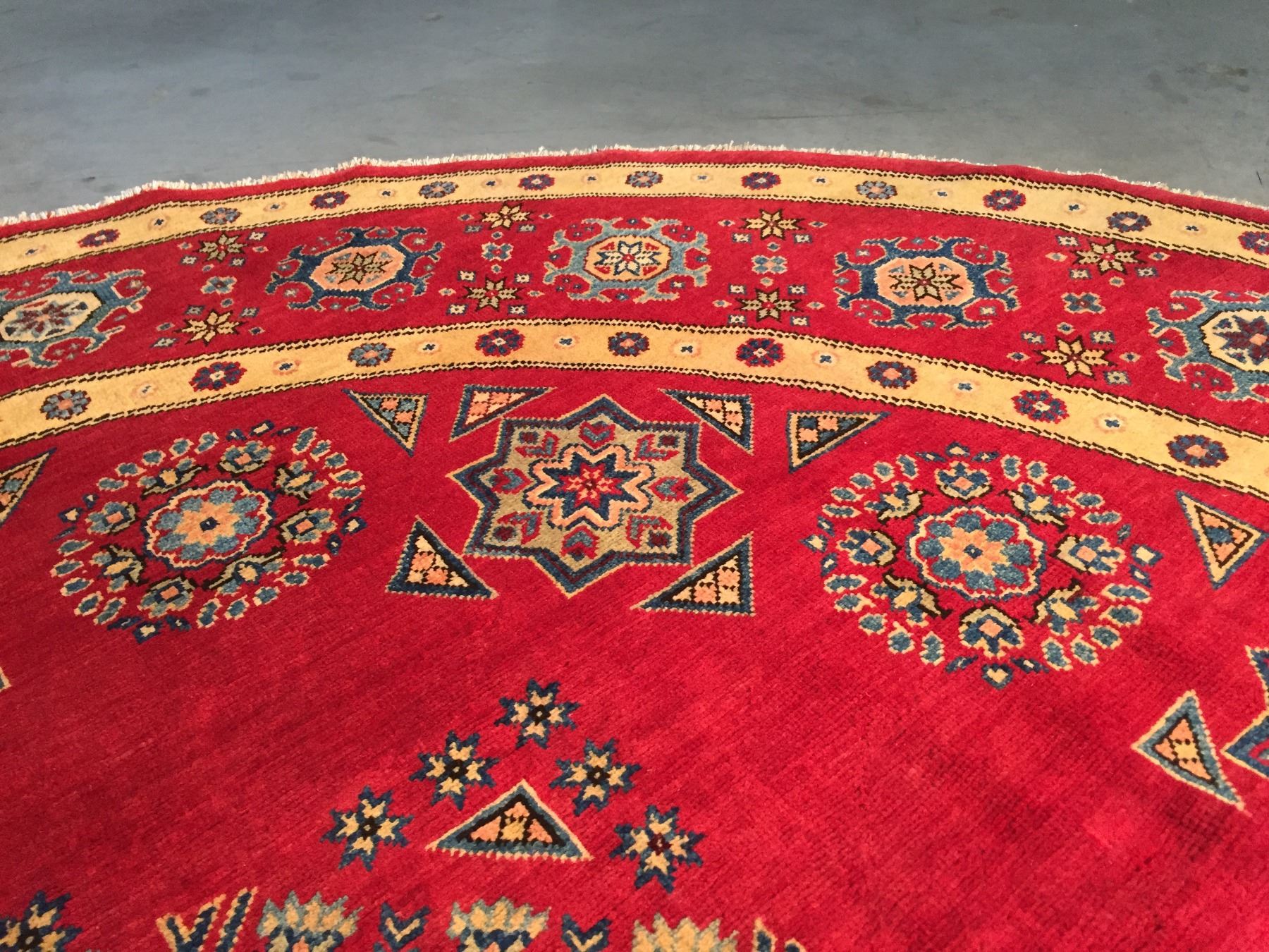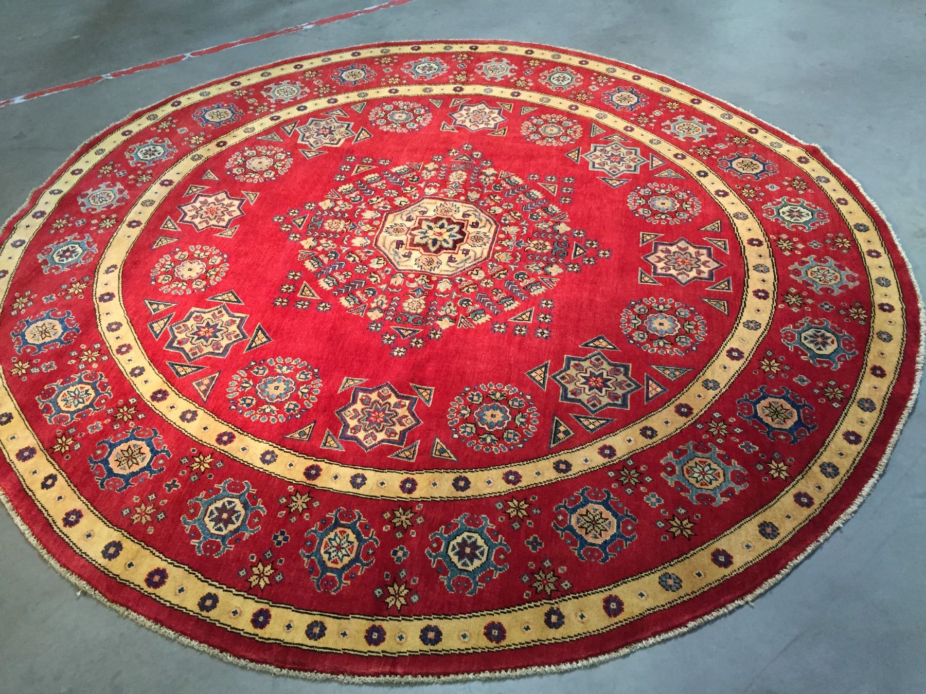 8 ft round Kazak, rug, 100% natural vege dye wool pile, Red and multi accent colors, designed and hand knotted in Pakistan