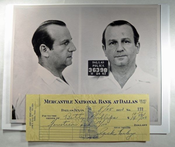 AUTHENTIC JACK RUBY SIGNED CHECK WITH A COPY OF THE NOVEMBER 1963 MUG-SHOT OF JACK RUBY FROM THE DALLAS POLICE. THIS CHECK WAS PURCHASED YEARS AGO BY THE CONSIGNER FROM JACK RUBY'S BROTHER EARL RUBY. THIS IS A 1953 CHECK FROM JACK RUBY'S ERVAY THEATER WHICH HE RAN FOR A SHORT TIME. CHECK IS IN VERY, VERY NICE CONDITION AND 100% AUTHENTIC. WE HAVE SEEN THESE ON EBAY LISTED AT 3000.00-4000.00. OWN AN AUTHENTIC PIECE OF HISTORY FROM THE JFK ASSASINATION!