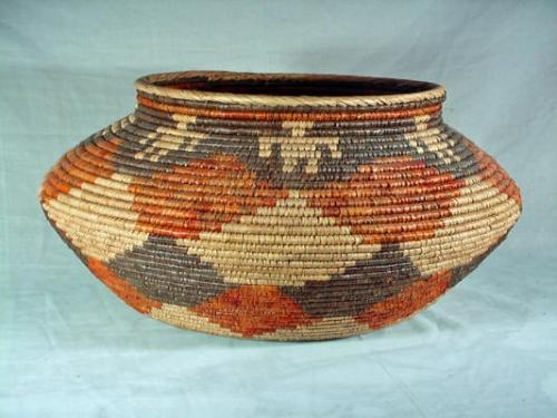 AUTHENTIC NATIVE AMERICAN COIL BASKET IN BEIGE, RUST, AND BROWN. 18" X 18" X 11"