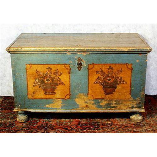 Painted furniture is one of the most beautiful expressions of FOLK ART. Today these examples of the FOLK ART, dating from 1750-1850, are collected not only as functional and highly decorative interior centerpieces, but as a solid investment into 21st Century. This is magnificent, circa 1800-50, hand dovetailed "six board" construction FOLK ART blanket chest, decorated with flowers on yellow and brick red background (flowers were symbol of fertility). Top (in plain panels) and sides (floral panels) are also decorated. It is in very good condition, considering its age. Inside has a small separate compartment on the upper left side. Please see photo of the inside, which is not of this piece, but typical of all blanket period blanket chests. Like in vast majority of blanket chests of this age, legs and some trim molding may have been replaced. Origin of this piece is Bohemia, Sudetten region, where the most beautiful painted armoires and blanket chests originated. It is contemporary of American "Pennsylvania Dutch" pieces made by German immigrants, who came to the United States from the above mentioned area in 18-19th century. Size : 46"W x 27"H x 25"D, weight approximately 80-100 lbs. You can personally inspect this (and other great pieces), we are located between Chicago and Milwaukee. If you need directions, please inquire. In some cases photo sizes are automatically reduced. So, if you want to see larger, more detailed photos, please email us at (). Buyer ...