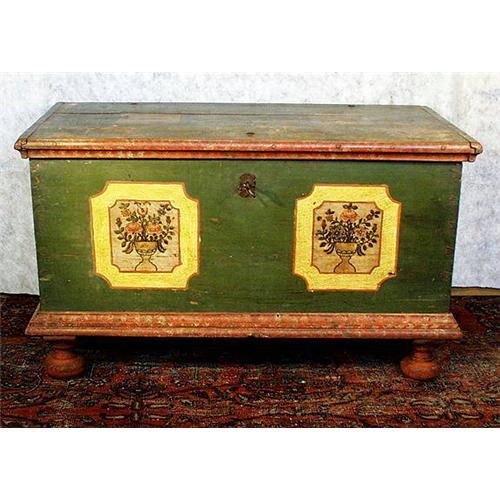 Painted furniture is one of the most beautiful expressions of FOLK ART. Today these examples of the FOLK ART, dating from 1750-1850, are collected not only as functional and highly decorative interior centerpieces, but as a solid investment into 21st Century. This is magnificent, circa 1800-50, hand dovetailed "six board" construction FOLK ART blanket chest, decorated with floral bouquets on cream / yellow background (flowers were symbol of fertility). Top (faint/worn) is also decorated. It is in very good condition, considering its age. Inside has a small separate compartment on the upper left side. Please see photo of the inside, which is not of this piece, but typical of all blanket period blanket chests. Like in vast majority of blanket chests of this age, legs and some trim molding may have been replaced. Origin of this piece is Bohemia, Sudetten region, where the most beautiful painted armoires and blanket chests originated. It is contemporary of American "Pennsylvania Dutch" pieces made by German immigrants, who came to the United States from the above mentioned area in 18-19th century. Size : 48"W x 28"H x 25"D, weight approximately 80-100 lbs. You can personally inspect this (and other great pieces), we are located between Chicago and Milwaukee. If you need directions, please inquire. In some cases photo sizes are automatically reduced. Buyer to pick up at our location or arrange for shipping. For information you can contact these shippers we used in the past - ...