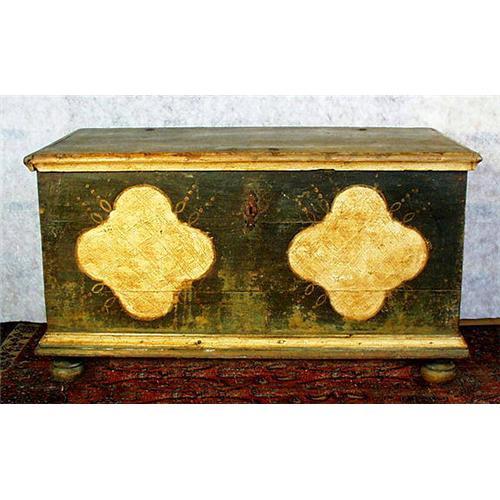 Painted furniture is one of the most beautiful expressions of FOLK ART. Today these examples of the FOLK ART, dating from 1750-1850, are collected not only as functional and highly decorative interior centerpieces, but as a solid investment into 21st Century. This is magnificent, circa 1800-50, hand dovetailed "six board" construction FOLK ART blanket chest, painted with ornamental decor on dark blue/green background. The top (faint/worn) and sides are also decorated. It is in good condition, considering its age. Inside has a small separate compartment on the upper left side. Please see photo of the inside, which is not of this piece, but typical of all blanket period blanket chests. Like in vast majority of blanket chests of this age, legs and some trim molding may have been replaced. Origin of this piece is Bohemia, Sudetten region, where the most beautiful painted armoires and blanket chests originated. It is contemporary of American "Pennsylvania Dutch" pieces made by German (Deutsch) immigrants, who came to the United States from the above mentioned area in 18-19th century. Size : 49-1/2"W x 27"H x 26-1/2"D, weight approximately 80-110 lbs. Please note that reserves on our blanket chests range between $1600-$2950. Only bids over $1600 may meet the reserve or be considered. You can personally inspect this (and other great pieces), we are located between Chicago and Milwaukee. If you need directions, please inquire. Buyer to pick up at our location or arrange for shipping. ...