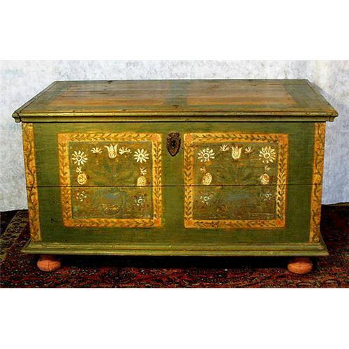 Painted furniture is one of the most beautiful expressions of FOLK ART. Today these examples of the FOLK ART, dating from 1750-1850,  are collected not only as functional and highly decorative interior centerpieces, but as a solid investment into 21st Century. This is magnificent, circa 1800-50, hand dovetailed "six board" construction FOLK ART blanket chest, decorated with floral bouquets on green background (flowers were symbol of fertility). Top (plain panels) and sides (floral panels) are also decorated. It is in very good condition, considering its age. Inside has a small separate compartment on the upper left side. Please see photo of the inside, which is not of this piece, but typical of all blanket period blanket chests. Like in vast majority of blanket chests of this age, legs and some trim molding may have been replaced. Origin of this piece is Bohemia, Sudetten region, where the most beautiful painted armoires and blanket chests originated.  It is contemporary of American "Pennsylvania Dutch" pieces made by German immigrants (Deutsch), who immigrated to the United States from the above mentioned area in 18-19th century. Size : 46"W x 27"H x 25"D, weight approximately 80-100 lbs. Please note that our blanket chests are priced between $1600-$3995, and only bids above $1800 will meet our reserve for this piece. We sold 6 blanket chest on Ebay Live Auctions to happy customers in price range of $1600-$2875. You can personally inspect this (and other great pieces), we are ...
