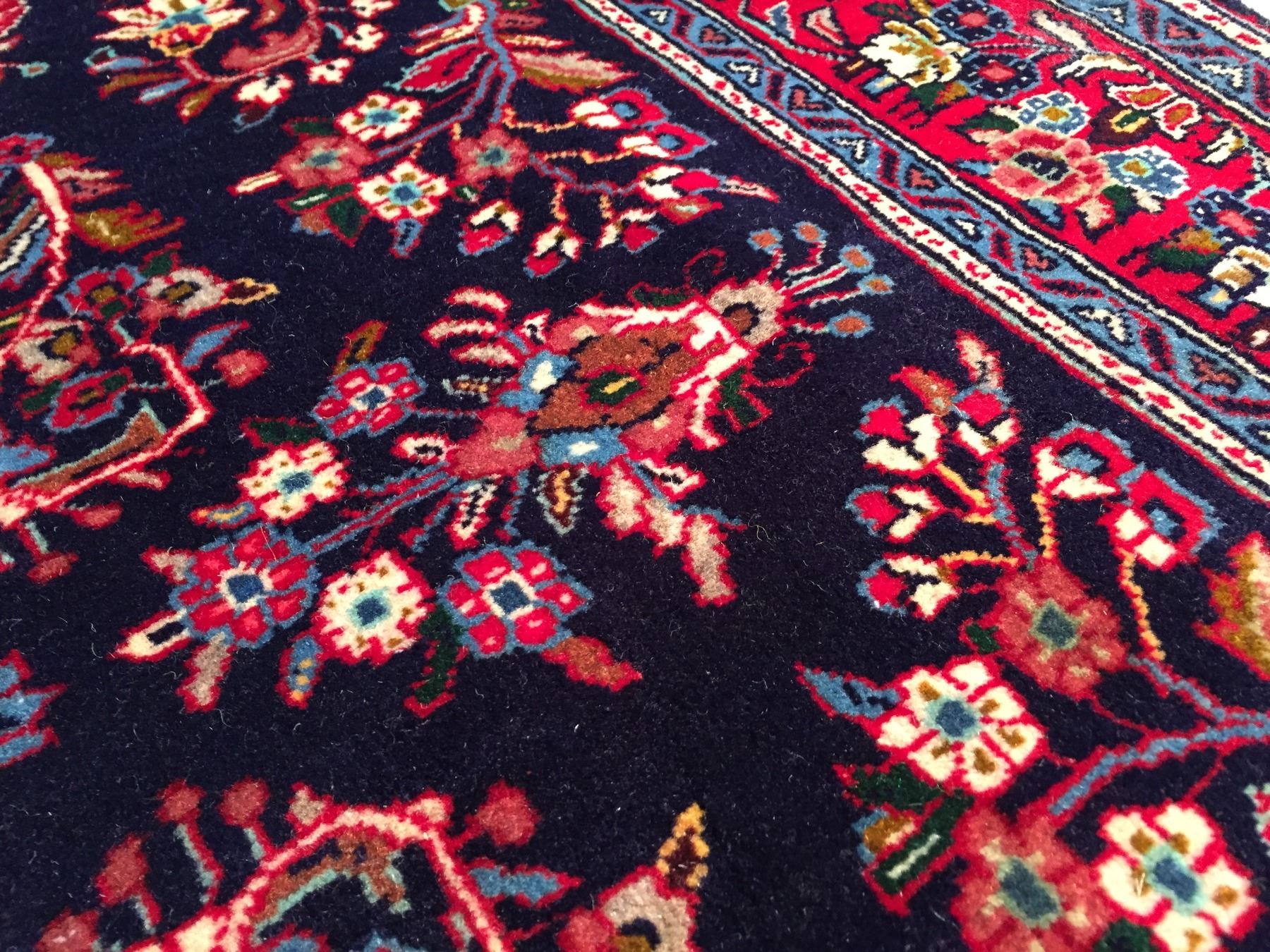 4'.3"X6'.9" Authentic Persian Sarouk Rug,in excellent condition Navy blue and multi accent colors , Vege dye Hand Knotted in Iran 100% Natural wool pile
