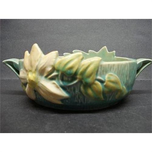 HERE IS MOST BEAUTIFUL AUTHENTIC ROSEVILLE,CLEMATIS BOWL, DEPICTING MAGNIFICENT,LARGE CLEMATIS BLOSSOMS,IT IS PROPERLY SIGNED AT THE BOTTOM,as per images - Measures from handle to handle about 8 3/4" x 6 1/2" x 3" high,Excellent condition, no chips, cracks or repairs but for glaze crazing and there are stains on inside which i do not know if can be cleaned - US Buyer to pay 9.00 for shipping plus insurance,THANKS.