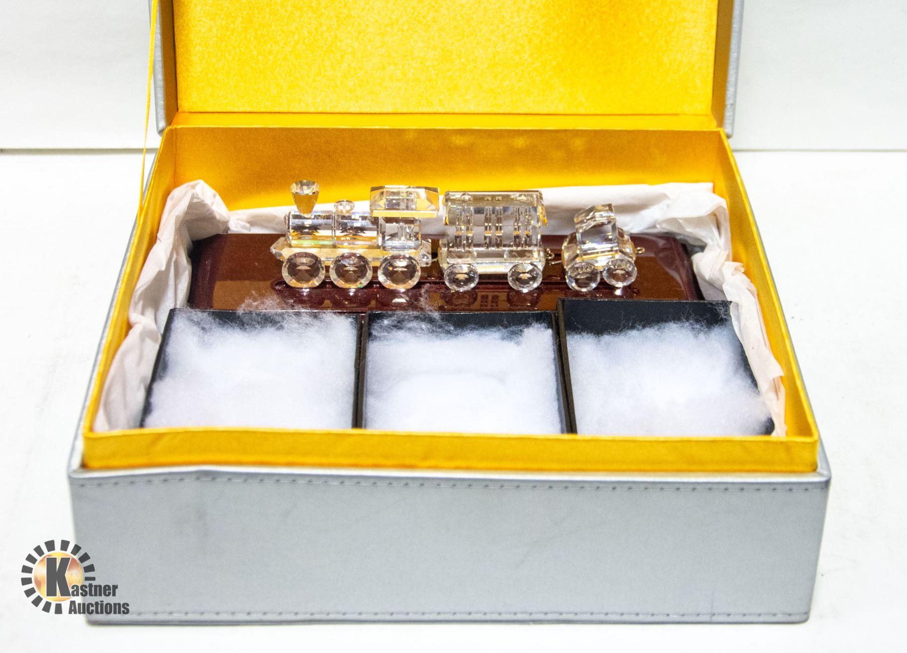 SET IN DECORATIVE GIFT BOX - ROSEWOOD STAND WITH LOCOMOTIVE (2.5"L X 1.25"W X 1.5"H), PASSENGER CAR (2"L X 1.25"W X 1.5"H) AND CABOOSE (1.5"L X 1.25"W X 1"H) **ALL ITEMS MUST BE REMOVED BY 5PM SATURDAY, NOVEMBER 30TH 2024. ALL REMAINING ITEMS WILL BE SUBJECT TO A $6.00 PER DAY STORAGE CHARGE. ANY ITEMS REMAINING AFTER MONDAY, DECEMBER 16TH 2024 WILL BE CONSIDERED FORFEITED. NO REFUNDS WILL BE ISSUED FOR FORFEITED ITEMS. TO SCHEDULE A PICK UP APPOINTMENT CLICK HERE
