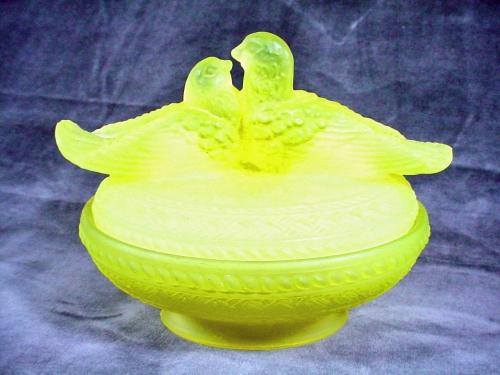 AUTHENTIC VINTAGE WESTMORELAND VASELINE COVERED LOVEBIRD DISH. 5.5" X 6"