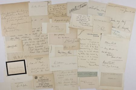 A lot of over 25 signatures of authors and educators from the nineteenth and early twentieth centuries, various formats but most being signed cards mounted or with mounting remains, includes: LOWELL THOMAS, MARY HOWITT, OLIVER WENDELL HOLMES, WILL CARLETON, EDWIN ARNOLD, EDMUND CLARENCE STEDMAN, DOROTHY THOMPSON, GRACE GREENWOOD, FRANKLIN D. SARGENT, REGINALD FARRAR, ROBERT C. OGDEN, NORMAN DUNCAN, DAVID STARR JORDAN, LYON G. TYLER, EDWARD EGGLESTON, ELIZA TABOR, ALBERT PAYSON TERHUNE, A. T. QUILLER-COUCH, SARA A. PRYOR, IAN MACLAREN, CHARLES E. BENNETT, JAMES B. AUGUST, ALFRED AUSTIN and more. Very good.