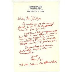 <b>1226. AUTHORS </b> Lot of four pieces all written to Erika Holzer, author of the novel <i>An Eye for An Eye</i> which became a major motion picture in 1996 starring Sally Field. The group includes <b>MARIO PUZO,</b> A.L.S. 1p. 8vo., Bayshore, L.I., [n.d.]. In part: "É<i>Quotes never do much good, so don't be disappointed I can't give you one...</i>"; <b>JOYCE CAROL OATES</b>, A.N.S. 1p. on a postcard, Princeton, Dec. 23, 1982 declining to endorse Holzer's book <i>Double Crossing</i>: <i>"...I receive so many requests for endorsements I've had to make it a policy to very rarely give them...</i>" Light dampstains<b>; SUE GRAFTON</b>, T.L.S. "<i>Sue</i>" on the recto and verso of a 6 1/2" x 5" card, [n.p.], Nov. 29, 1992. In part: <i>"...I'm also gearing up for `K' which means an end to any reading except for fun. I wish I could help with your request for a blurb, but I'd go mad these days trying to keep up. It does sound like your publisher is really getting behind you and I hope the strategy works. I took me six books and I never did really break out...As far me, I still don't have a clue what `K' is all about and I'm trying not to panic...</i>"; <b>ISAAC ASIMOV</b> T.L.S. 1p. 8vo., New York, Apr. 24, 1980 regarding an endorsement: <i>"...I am very sorry to say that I am not [underlined] an exception. I, too, plead lack of time...If it will make you feel any better, there is a continuing strain on my otherwise-happy marriage over the fact that I won't and don't read my wife's novels...</i>". Trimmed. Four pieces in very good condition.<b> $300-400</b>