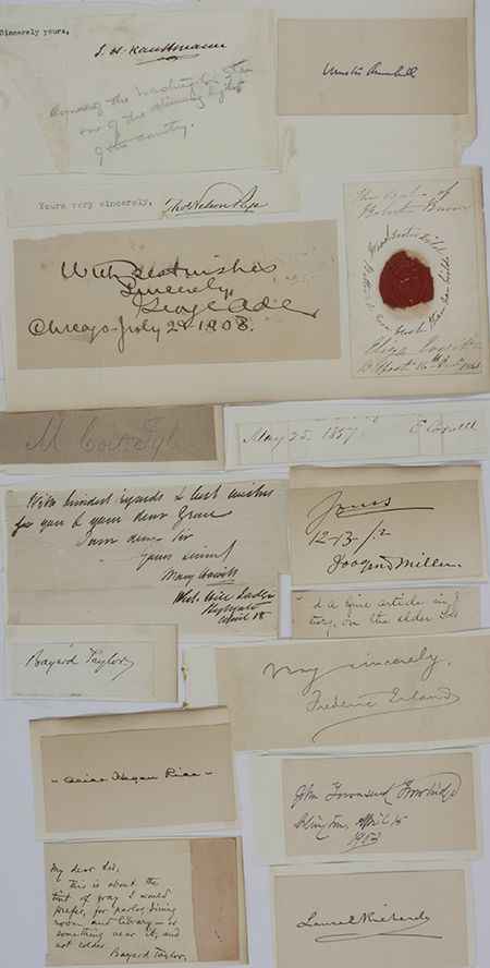 A lot of 16 signatures of nineteenth-century authors, each executed on a small sheet and mounted. Includes: BAYARD TAYLOR (2), MOSES COIT TYLER, ALICE HEGAN RICE, LAURA E. RICHARDS, JOHN TOWNSEND TROBRIDGE, GEORGE ADE, JOACHIN MILLER, THOMAS NELSON PAGE, E. CORNELL, S. H. KAUFFMAN, LUCY DERBY FULLER and more not identified by us. Overall very good condition.