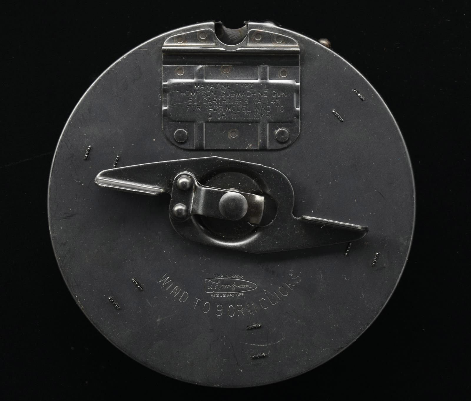 Cal. 45 ACP. Satin black finish w/ front plate reading “MAGAZINE TYPE “L” / THOMPSON SUBMACHINE GUN / 50 CARTRIDGES CAL .45 / FOR 1928 MODEL WIND TO / 9 OR 11 CLICKS.” Rear plate reads: “AUTO-ORDNANCE CORP. / NEW YORK / REGISTERED IN THE / U.S. PATENT OFFICE”. Front of drum on body at 6 o’clock position has Thompson bullet logo & “WIND TO 9 OR 11 CLICKS”. CONDITION: Finish is complete w/ only few light handling marks in the form of thinning in areas of mechanical intervention. (02-21080/JZ). $200-400.