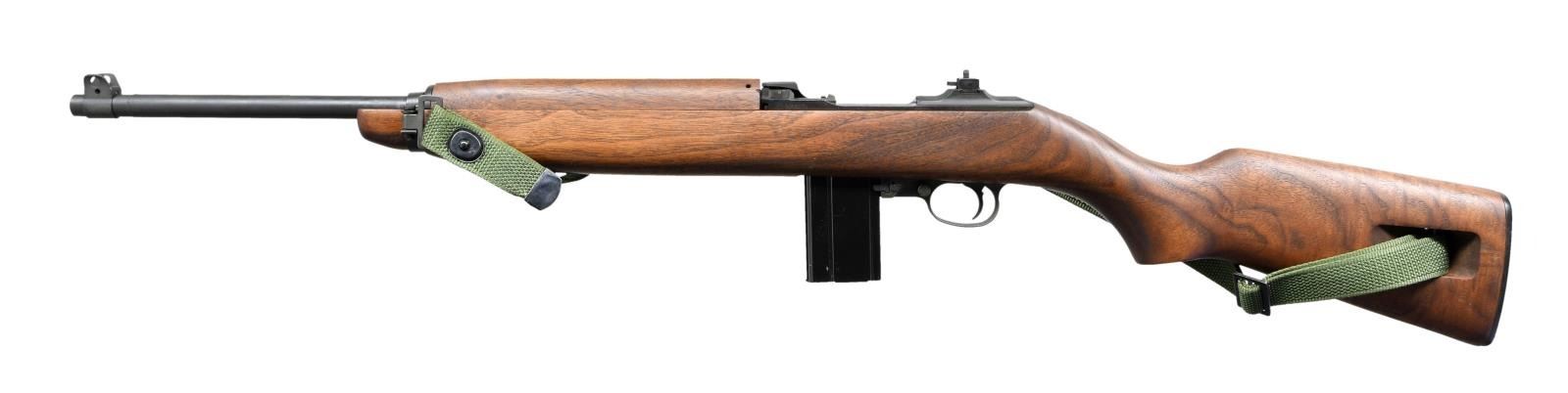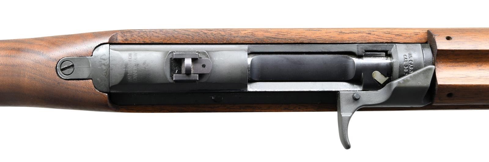 Cal. 30 Carbine. S# MA5171, Bbl. 18" Flip type aperture rear sight. Blade front sight w/ protective ears. These carbines were mfg. to replicate the WWII era M1 Carbines using investment castings where possible. Parts may not interchange w/ vintage military carbines. The slide is a 6 o'clock type. Bbl. band made w/out bayonet lug. The trigger group has a push button safety. Mag. catch is provided w/ projection for 30 rd. mags. Receiver is marked at rear "AUTO-ORDNANCE WORCHESTER MA". Receiver is additionally marked underneath w/ "AUTO-ORDNANCE". These markings are not visible when rifle is assembled. Walnut stock is cut for oiler. Handguard made for two rivets. Green web sling. MAGS: 1-15 rd. CONDITION: metal & stock finish show little indication of use w/ only wear marks in action area & tiny handling marks in stock finish. (23-1103/RW). CURIO. $400-600.