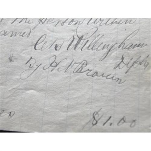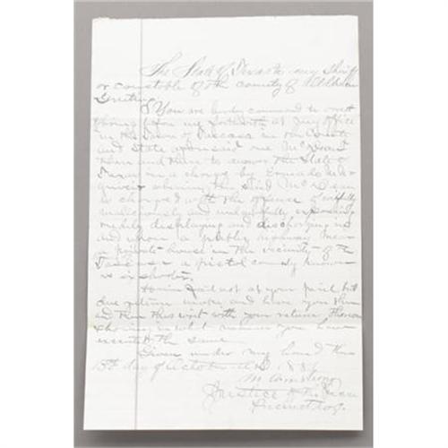 <B>AUTOGRAPH BY FAMOUS LAWMAN-OUTLAW HENRY BROWN 1881</B></I> - Henry Newton Brown (1857-1884) was a lawman and also an outlaw in his very short life. Henry Brown was raised in Rolla, Missouri, by relatives until the age of seventeen, when he left home and headed west. He drifted through various cowboy jobs in Colorado and Texas, supposedly killing a man in a gunfight in the Texas Panhandle.<BR><BR> This is a very nice historical document for an arrest warrant for Mr. Mcdean for discharging #6 a pistol, commonly know as a “six shooter” at Tascosa, Texas Oct. 13, 1881. Signed H. N. Brown. Very fine condition.<BR><BR><b>Shipping:</b> Flat Material, Small (<a target="_blank" href="http://www.heritageauctions.com/common/shipping.php">view shipping information</a>)