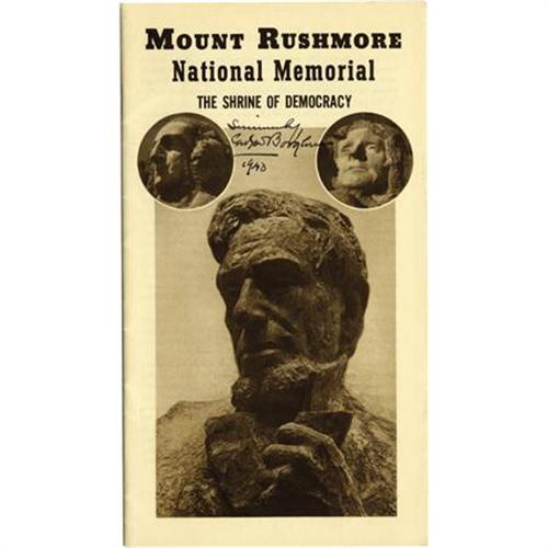 <B>AUTOGRAPH GUTZON BORLUM MOUNT RUSHMORE BOOKLET 1940</B></I> - Borglum, Gutzon (1867-1941) American sculptor. Won renown for his works of colossal proportion, such as the Famous <I>“Mount Rushmore National Memorial”</B></I> His other works include the head of Lincoln at (US Capitol Rotunda) and the 12 Apostles in St John's Cathedral in New York. At the time this booklet was published, Borglum's monumental sculpture was only ¾ completed, and the many sepia half-ton photographs depict the project in various stages of completion. This 32 page booklet signed by Borglum, Sincerely “Gutzon Borglum 1940.” 4.75”x 8.5”.<BR><BR><B>Condition:</B></I> Very Fine.<BR><BR><b>Shipping:</b> Flat Material, Small (<a target="_blank" href="http://www.heritageauctions.com/common/shipping.php">view shipping information</a>)