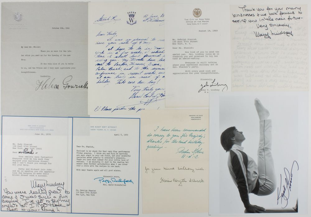 A group of eight autographs in various formats (noted), includes: JOHN LINDSAY, Mayor of New York, T.L.S. from 1969 sending thanks; an A.L.S. and T.L.S. from his wife, Mary Lindsay; a T.L.S. of PEGGY ROCKEFELLER, dated 1969 and sending thanks for omelets; DANIEL EARL OF HANOVER, A.L.S. 1983, arranging a meeting; Countess KARIN BIRGETTE SCHACK, A.L.S. 1953 sending thanks on behalf of the Queen of Denmark; HELENA RUBENSTEIN, T.L.S. 1941, sending thanks; gymnast KURT THOMAS, S.P. on the pommel horse, and one other not identified by us. Eight pieces, very good.