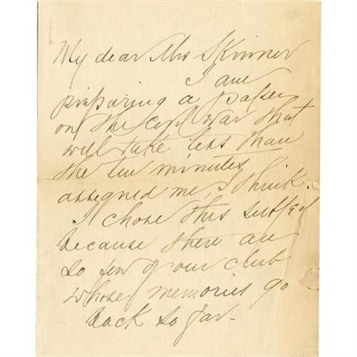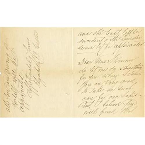 <B>AUTOGRAPHD LETTER ELIZABETH CUSTER</B></I> - Elizabeth Custer (1842-1933) Wife of General George Custer. Married in February 1864, Elizabeth was with him at the front during the last year of the Civil War, and also accompanied him in his nine years' on the Western frontier. Two pages, two-sided. Mrs. Custer writes: “My Dear Mrs. Skinner,” Regarding a speaking engagement. The letter reads "In part: I am preparing a paper on the Civil War that will take less than the ten minutes assigned to me, I think. I chose this subject because…the least little incident of Mr. Lincoln seems to be appreciated…you are very good to take on such care for our sakes. But..all you are giving of yourself will be appreciated. Affectionately yours, Elizabeth B. Custer. Very well penned an in fine condition, very small tears in folds. 10.5”x 6.5”.<BR><BR><b>Shipping:</b> Flat Material, Small (<a target="_blank" href="http://www.heritageauctions.com/common/shipping.php">view shipping information</a>)