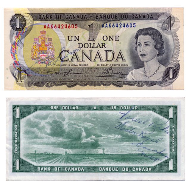 $1.00. 1954 Issue. BC-37b. No. W/N4561527. VF. Autographed on back by Mr. Norval Parker, Master, Royal Canadian Mint.6/5/65-State Coin Convention, Green Bay, Wisc.; $1.00. 1973 Issue. BC-46a-i. No. AAK6424605. EF. Autographed on front by R.W. Lawson, Deputy Governor, Bank of Canada, in Bermuda, 1981. Lot of two (2) notes.