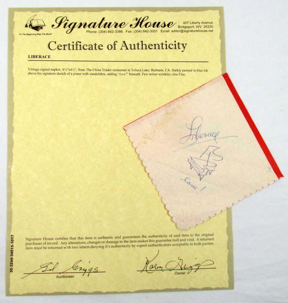 AUTOGRAPHED LIBERACE NAPKIN W/ COA